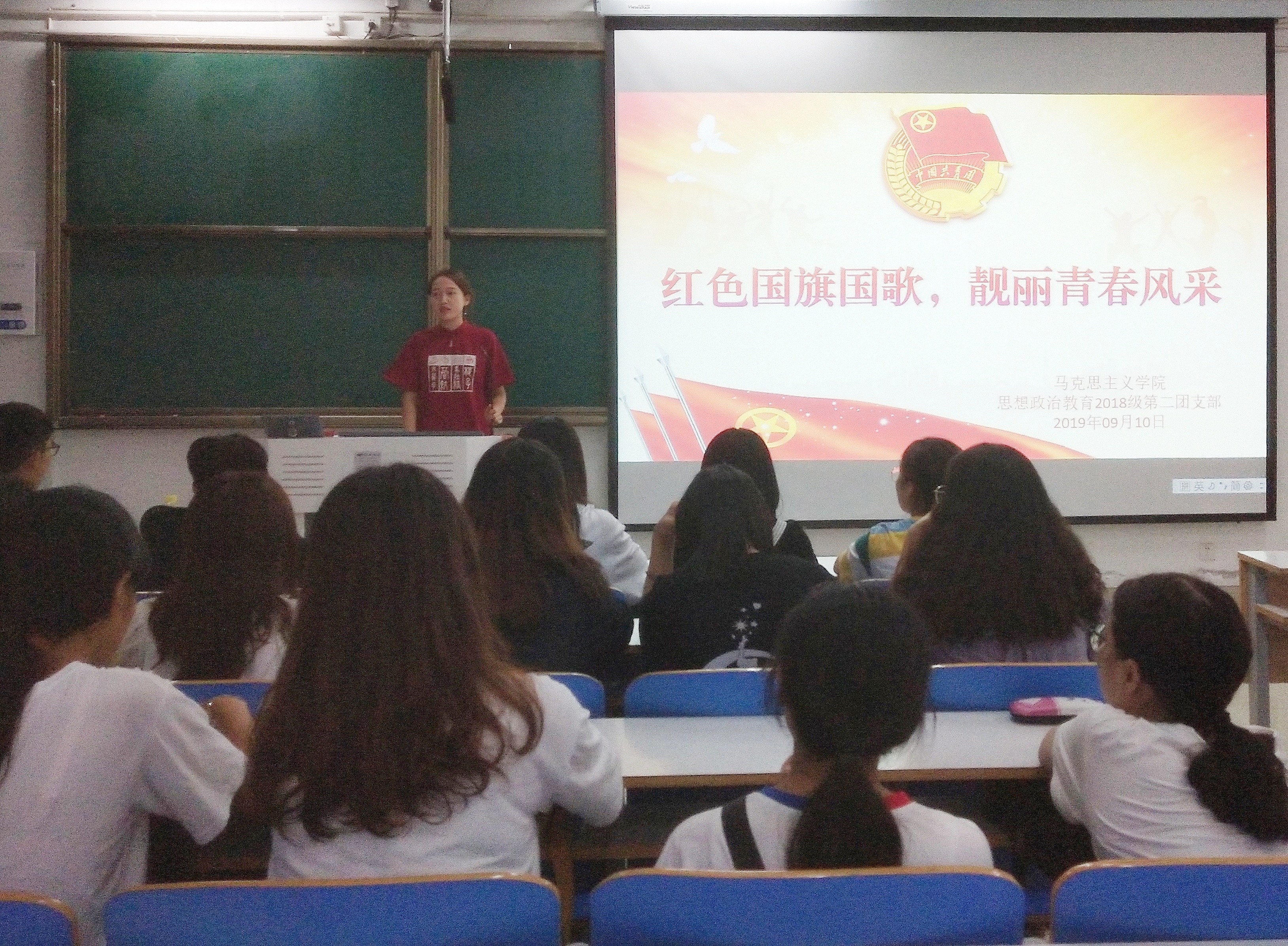 为进一步加深团员们对中华人民共和国国旗和国歌的认识,提升爱国主义情操,9月10日晚,世俱杯官网2018级思想政治教育二班在社科楼516教室开展了题为“红色国旗国歌,靓丽青春风采”团课。本次团课由团支部书记黄子晋主持。