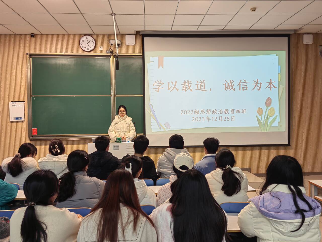 为提升我班学生学习氛围,激发学生学习内驱力, 12月25日下午,sjb世俱杯网站2022级思想政治教育四班在社科楼515教室召开“学以载道,诚信为本”期末动员主题班会。世俱杯官网2022级思想政治教育四班全体同学参与本次班会。本次会议由班长牛志杰主持。