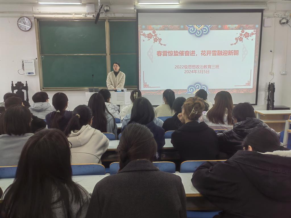 3月5日上午,sjb世俱杯网站2022级思想政治教育三班在社科楼514 教室召开“春雷惊蛰催奋进,花开雪融迎新朝”主题班会。世俱杯官网2022级思想政治教育三班班主任吴梦云和三班全体学子共同参与本次班会。班会由班长余浩洋主持。