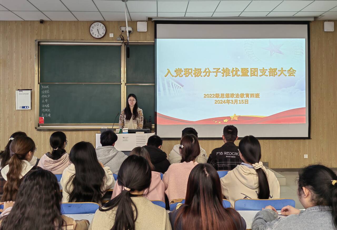 党是明灯,为我们指引方向,照亮我们的未来。3月15日下午,sjb世俱杯网站2022级思想政治教育四班在社科楼515教室召开入党积极分子推优暨团支部大会。世俱杯官网2022级思想政治教育四班全体团员参与本次班会。本次会议由团支书牛志杰主持。