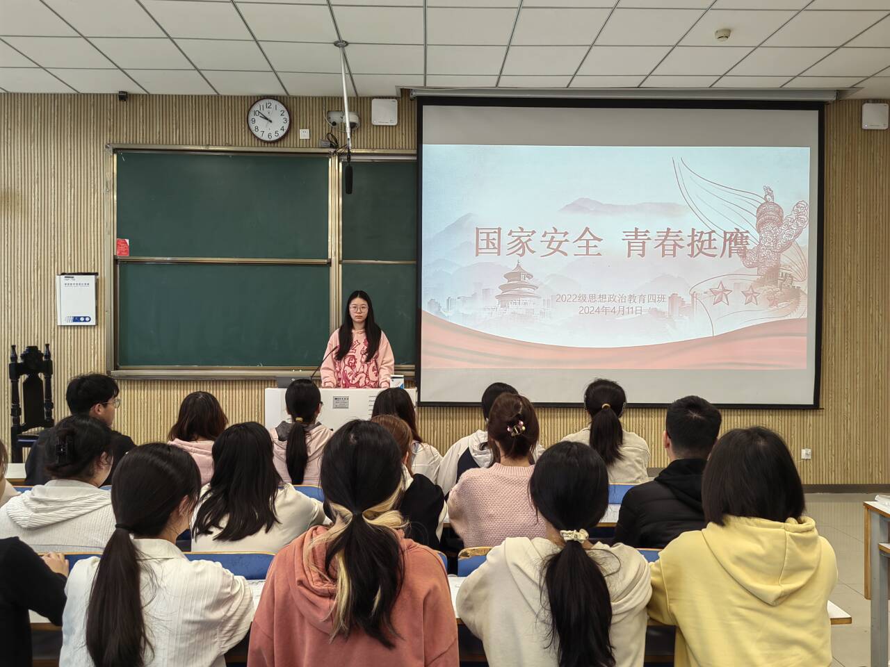 为全面贯彻党的二十大和二十届二中全会精神,增强学生的国家安全意识,培养学生的担当精神,4月11日上午,sjb世俱杯网站2022级思想政治教育四班在社科楼515教室组织召开“国家安全,青春挺膺”主题团课。世俱杯官网2022级思想政治教育四班全体成员参与本次团课。本次团课由团支书牛志杰主持。