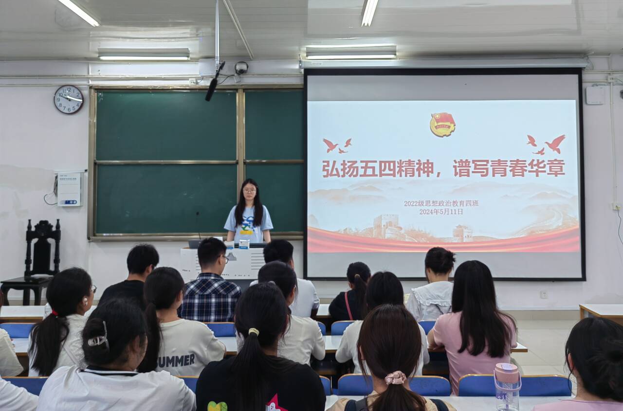 5月11日上午,sjb世俱杯网站2022级思想政治教育四班在社科楼514教室组织召开“弘扬五四精神,谱写青春华章”主题团课。世俱杯官网2022级思想政治教育四班全体成员参与本次团课。本次团课由团支书牛志杰主持。