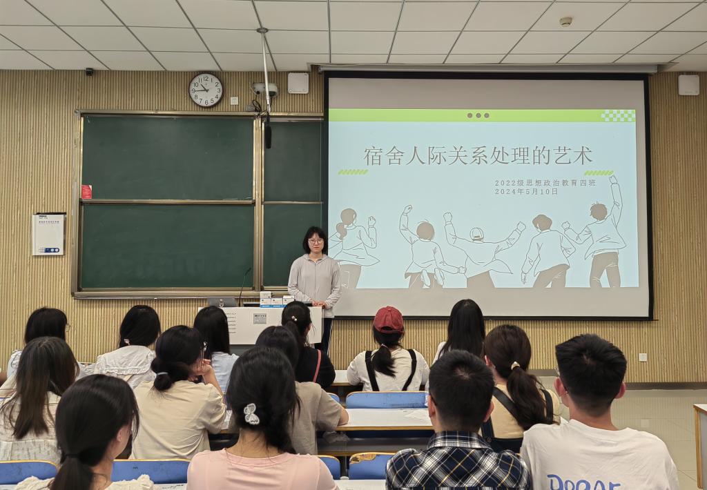 为进一步提高学生的心理健康水平,优化学生的心理素质,引导广大学生关爱自我的心理健康,5月10日上午,sjb世俱杯网站2022级思想政治教育四班在社科楼515教室组织召开“宿舍人际关系处理的艺术”心理班会。世俱杯官网2022级思想政治教育四班全体成员参与本次班会。本次班会由心理委员徐成若主持。