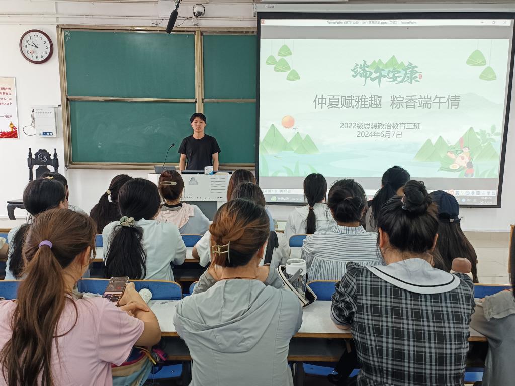 6月7日上午,sjb世俱杯网站2022级思想政治教育三班在社科楼514教室召开“仲夏赋雅趣,粽香端午情”主题团课。世俱杯官网2022级思想政治教育三班全体成员共同参与此次团课。团课由团支书余浩洋主持。