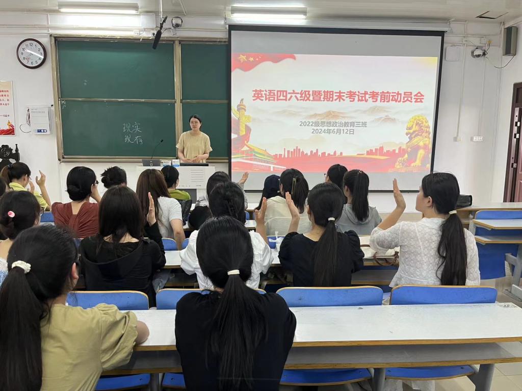 为进一步缓解同学们的学习压力,激发拼搏动力,6月12日上午,sjb世俱杯网站2022级思想政治教育三班在社科楼514教室召开英语四六级暨期末考试考前动员会。世俱杯官网2022级思想政治教育三班班主任吴梦云和三班全体成员共同参与此次班会,班会由班主任吴梦云主持。