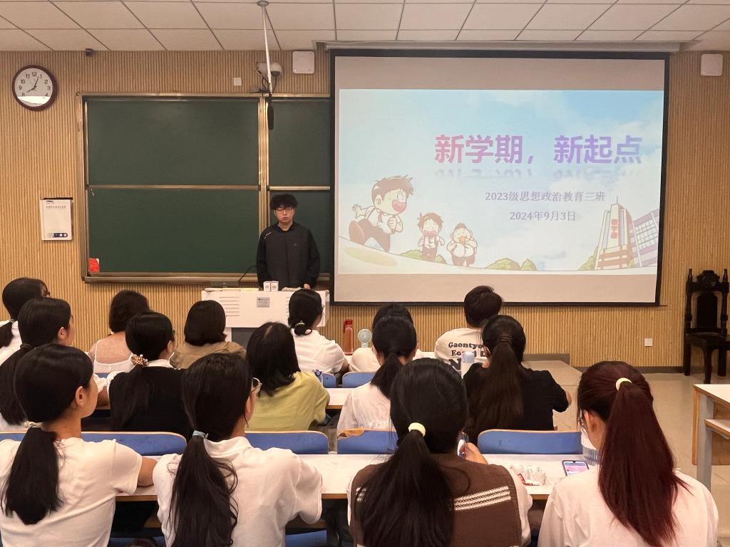 9月3日上午,sjb世俱杯网站2023级思想政治教育三班在社科楼515召开“新学期,新起点”主题班会。世俱杯官网2023级思想政治教育三班全体同学共同参与本次班会,班会由团支书郝瀚主持。