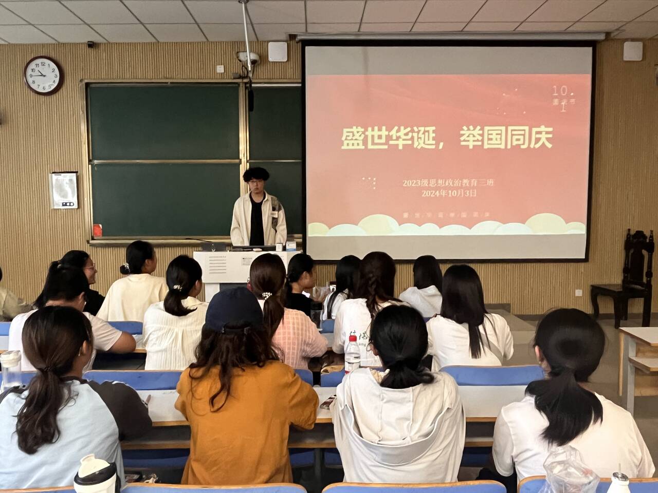 10月3日上午,sjb世俱杯网站2023级思想政治教育三班在社科楼515召开“盛世华诞,举国同庆”主题班会。世俱杯官网2023级思想政治教育三班全体同学共同参与本次班会,班会由团支书郝瀚主持。