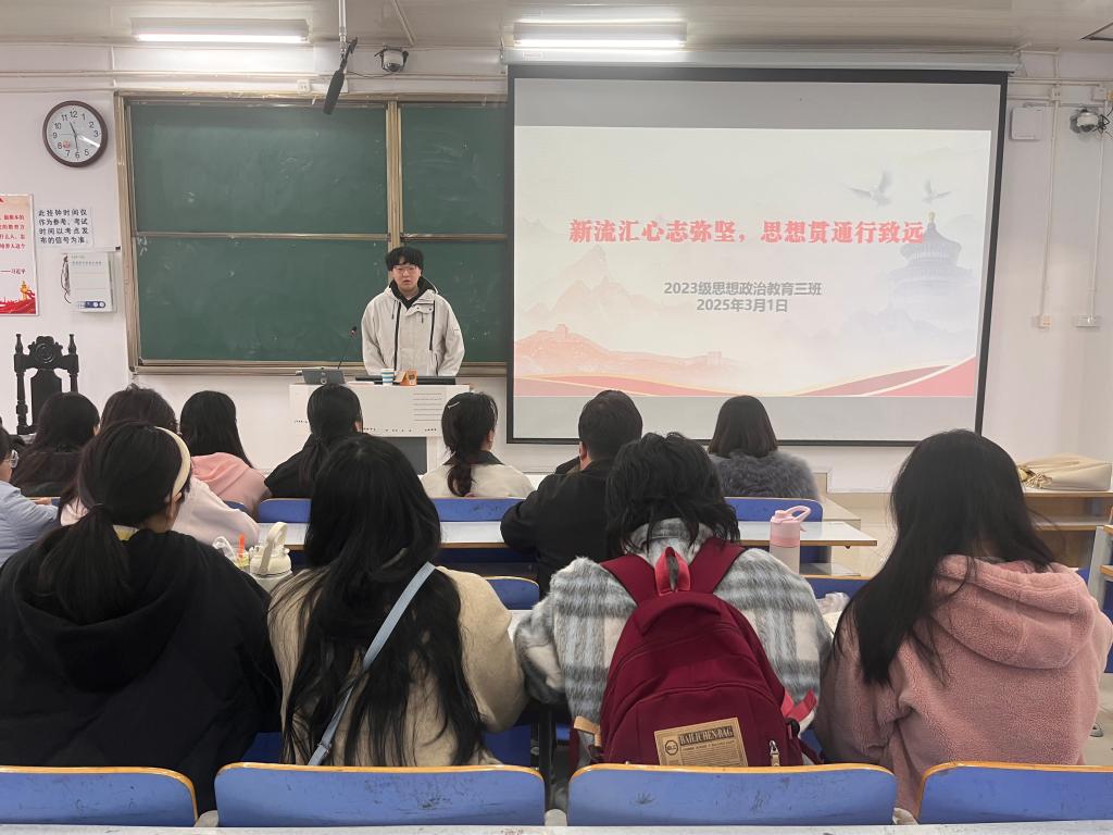 3月1日上午,sjb世俱杯网站2023级思想政治教育三班在社科楼515召开“新流汇心志弥坚,思想贯通行致远”主题团课。世俱杯官网2023级思想政治教育三班全体同学共同参与本次团课,团课由团支书郝瀚主持。