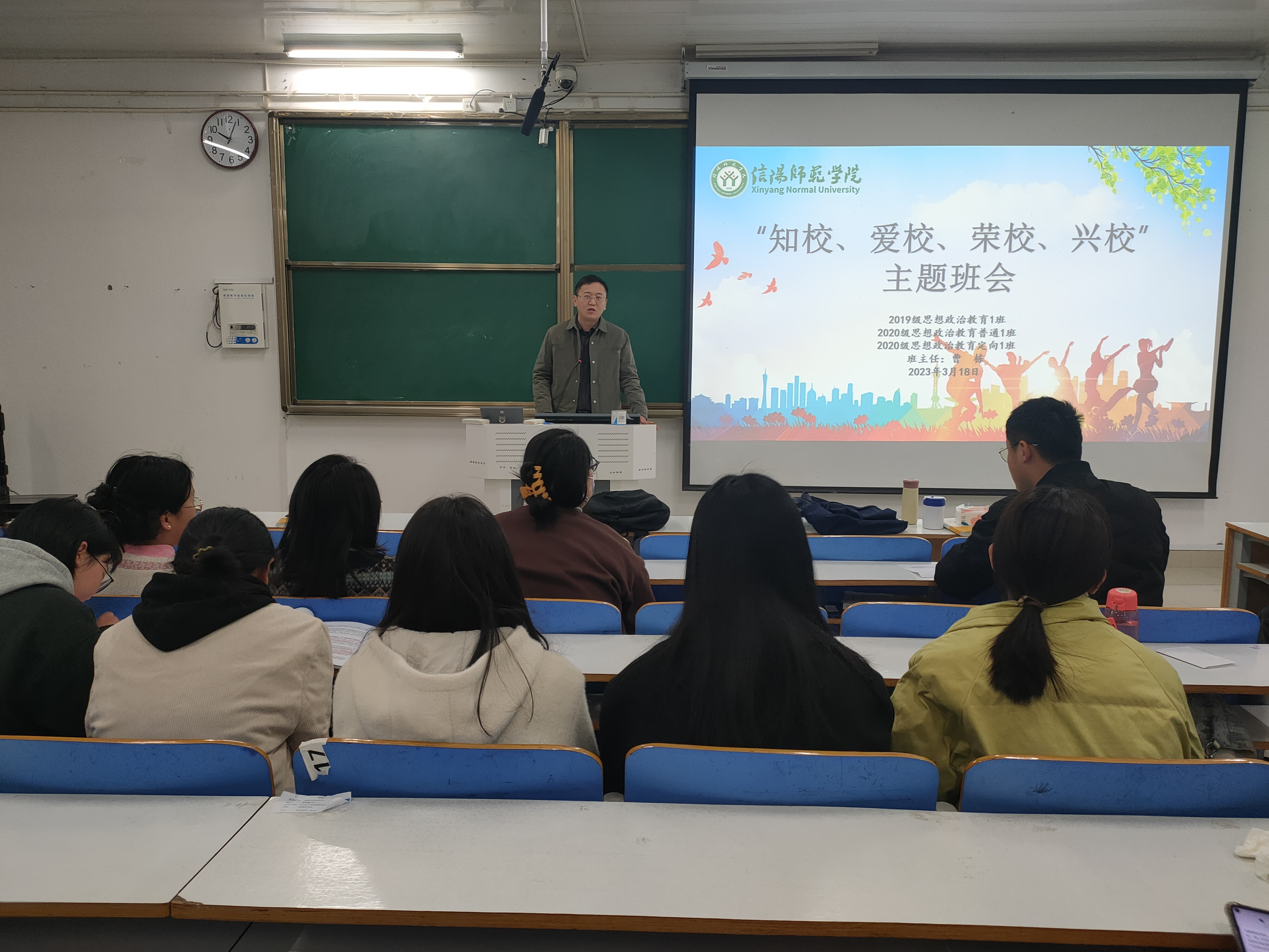 3月18日上午,sjb世俱杯网站2020级思想政治教育普通一班、定向一班在社科楼514教室顺利举行了知校、爱校、荣校、兴校主题班会。此次班会由辅导员曹栋主持。