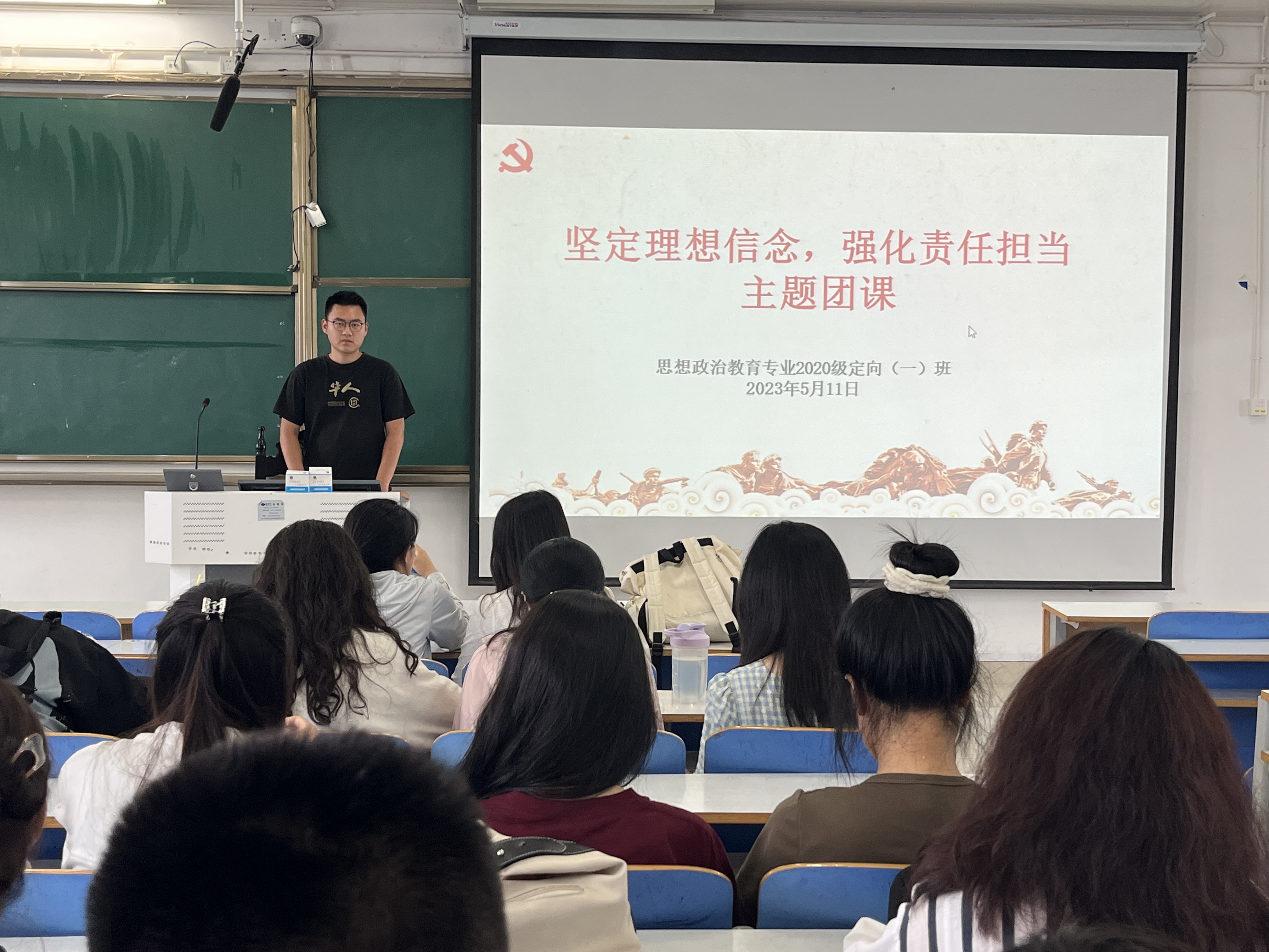 5月11日下午,sjb世俱杯网站2020级思想政治教育定向一班在社科楼514教室顺利举行了坚定理想信念,强化责任担当主题班会。此次班会由团支书朱紫峰主持。