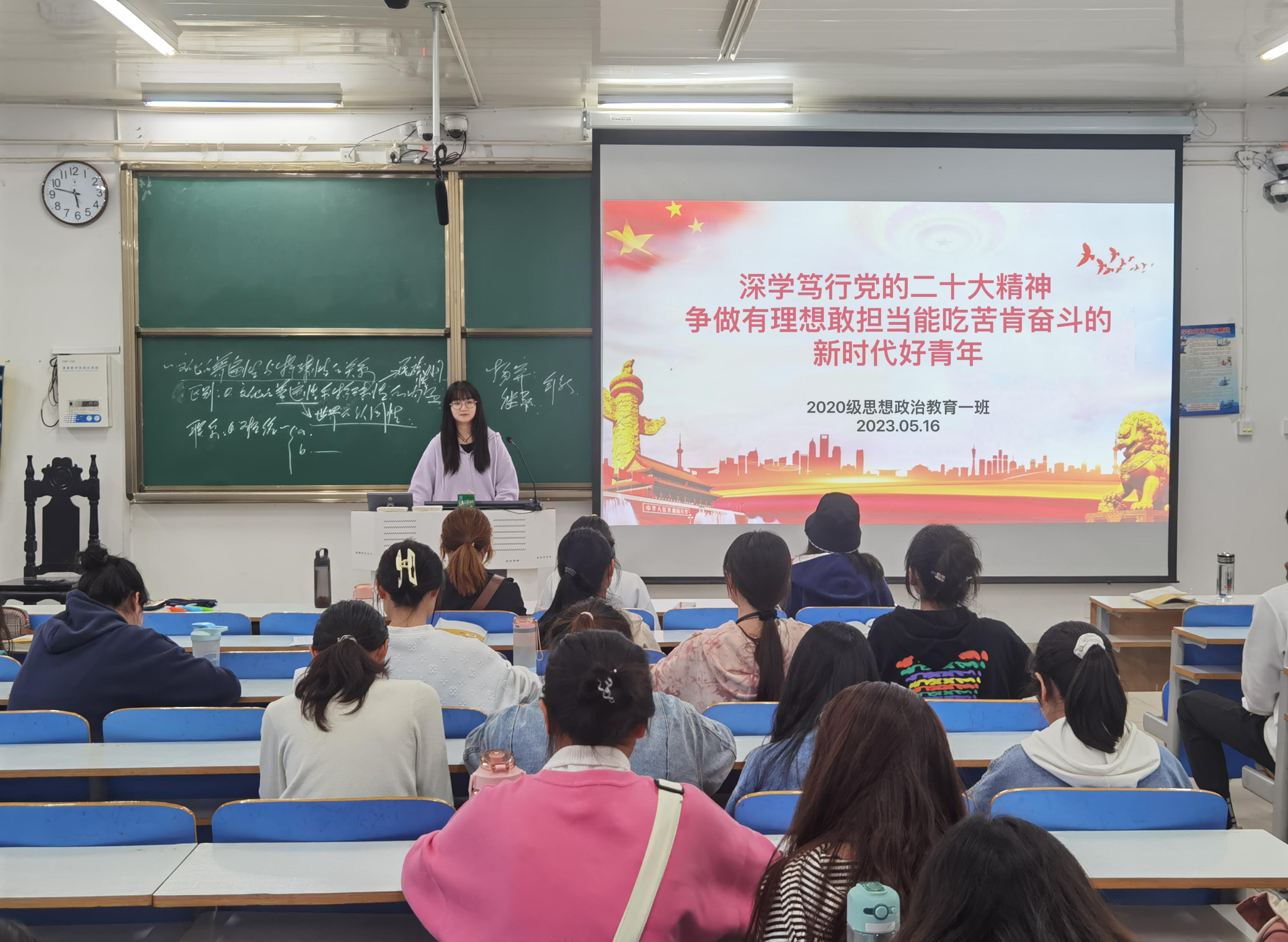 5月16日上午,sjb世俱杯网站2020级思想政治教育一班团支部在社科楼515教室召开“深学笃行党的二十大精神,争做有理想敢担当能吃苦肯奋斗的新时代好青年”主题教育活动。2020级思想政治教育一班团支部全体团员参加此次团课,团课由团支部书记卢茜雨主持。
