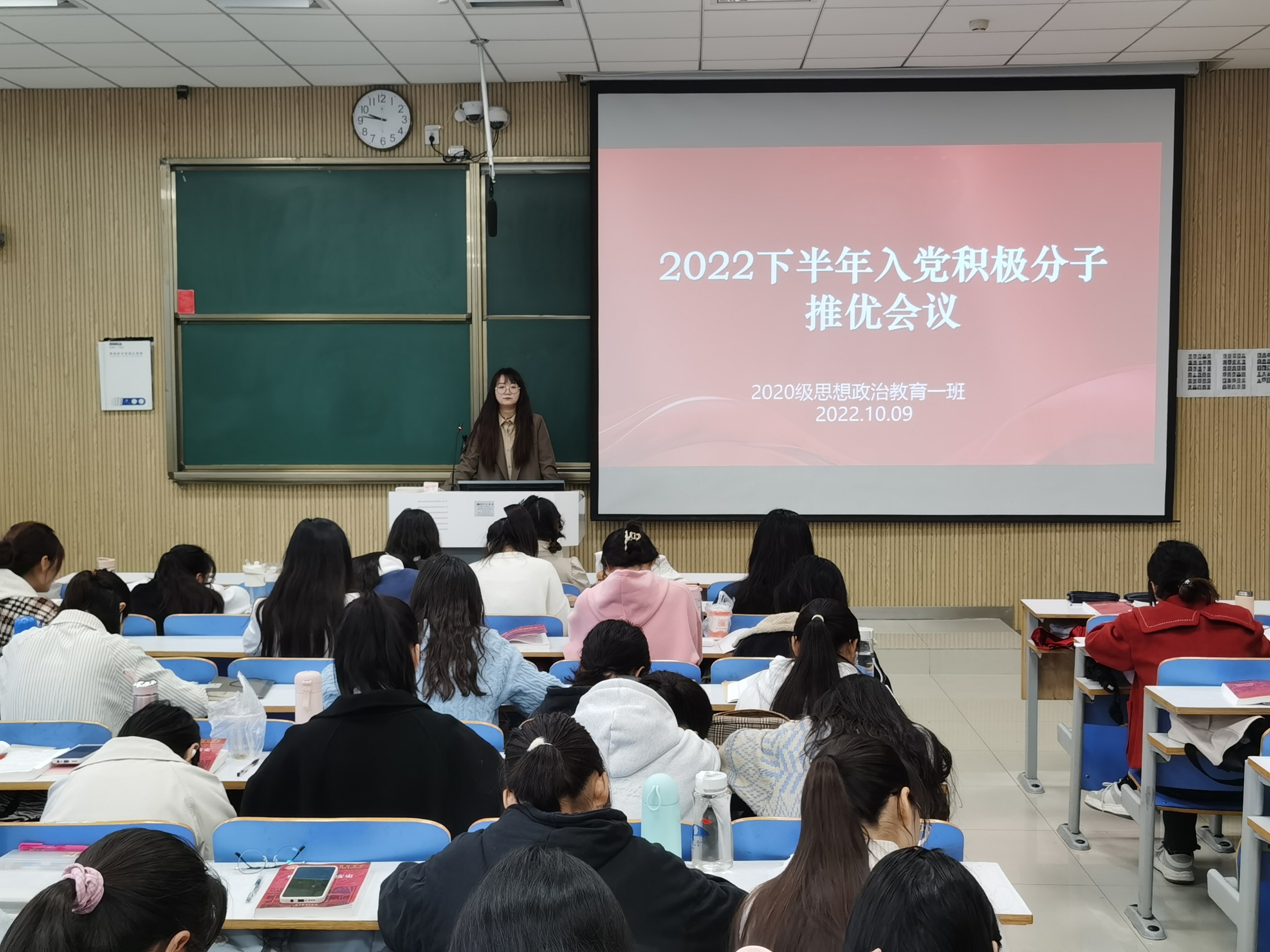 10月9日上午,sjb世俱杯网站2020级思想政治教育一班团支部在社科楼515教室召开2022年下半年入党积极分子推优会议。我支部全体团员参加此次推优会议,会议由团支部书记卢茜雨主持。