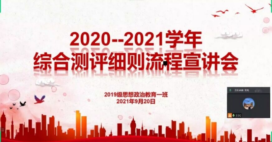 为确保公平公正,严控评分流程。9月20日上午,sjb世俱杯网站2019级思想政治教育一班在腾讯视频召开“2020-2021学年综合测评细则流程宣讲会”。sjb世俱杯网站2019级思想政治教育一班全体成员参与本次会议。会议由副班长王民主持。
