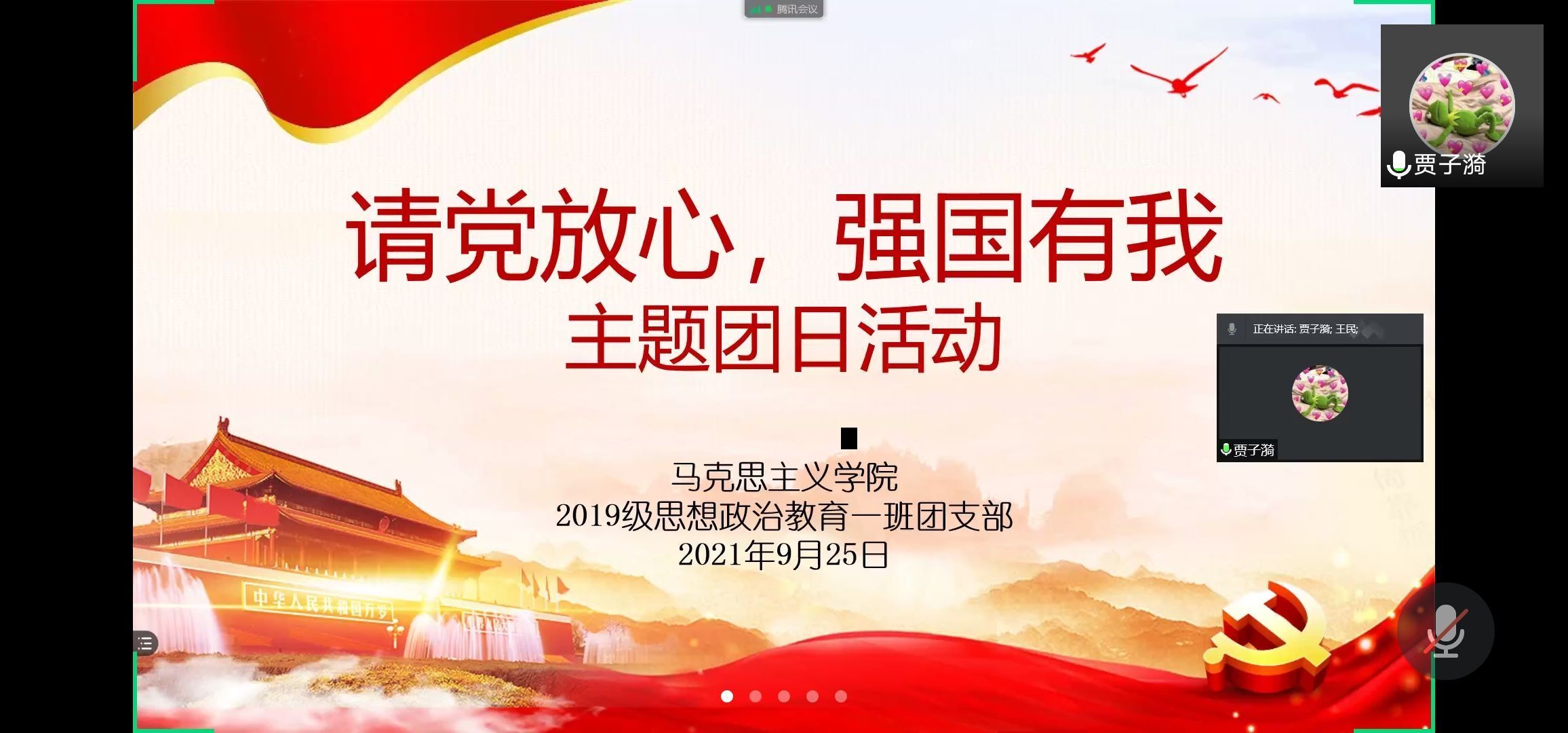 9月25日下午,sjb世俱杯网站2019级思想政治教育一班第一团支部在腾讯视频举办“请党放心,强国有我”主题团日活动。sjb世俱杯网站2019级思想政治教育一班全体团员参加本次活动。活动由团支书贾子漪主持。