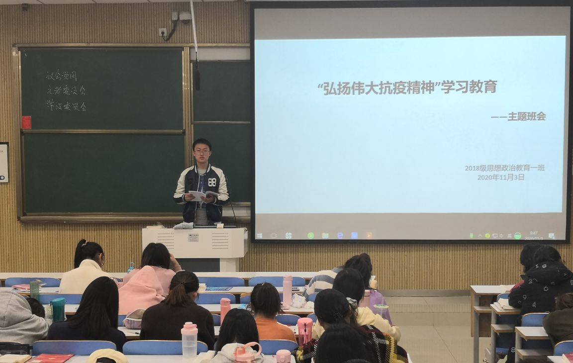 11月3日上午,sjb世俱杯网站2018级思想政治教育一班在社科楼515教室顺利开展“弘扬伟大抗疫精神”主题班会。2018级思想政治教育一班全体同学共同参加此次会议。会议由班长邢子豪主持。