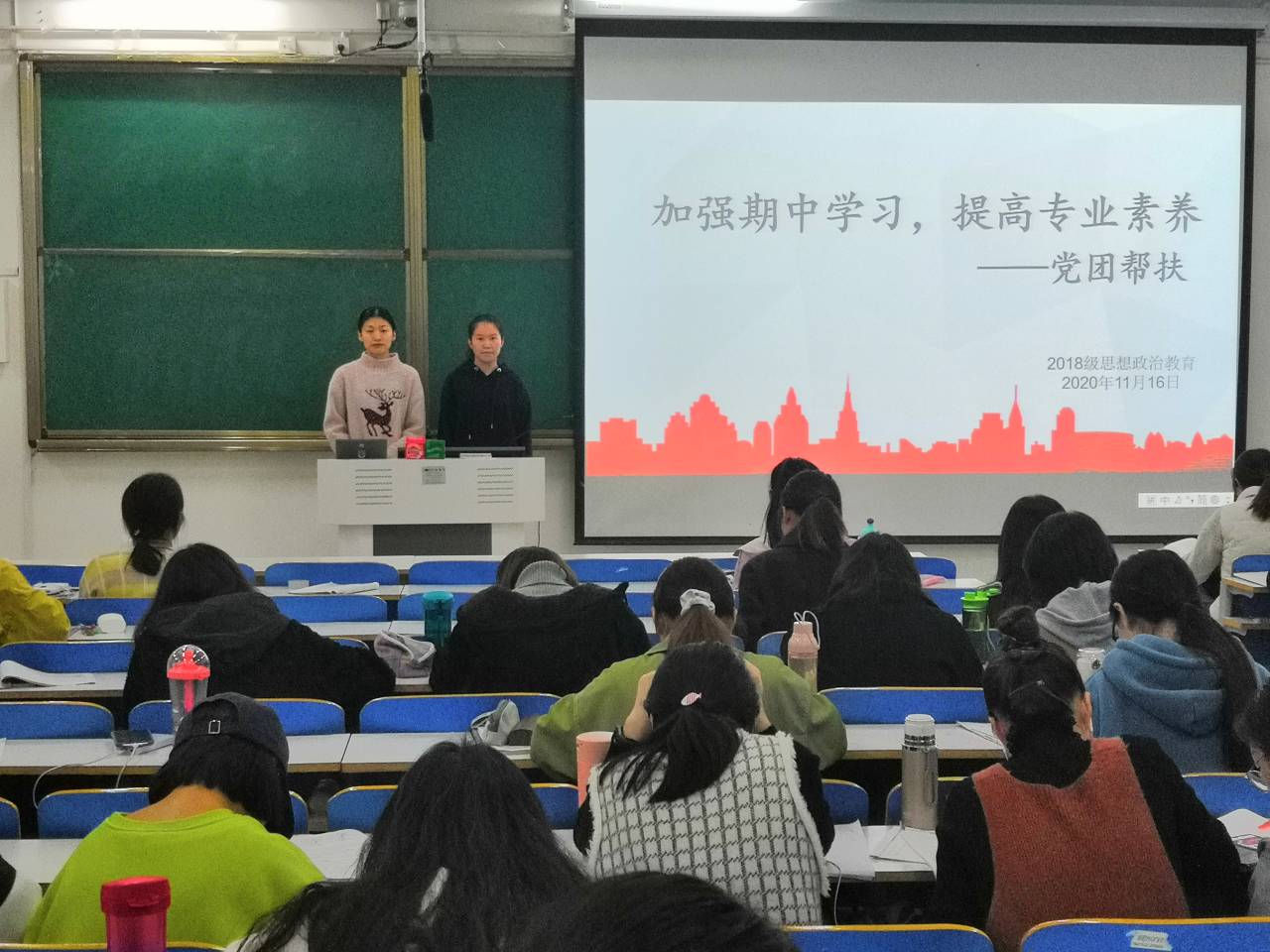 为了充分发挥党员干部的先锋模范作用,11月16日下午,sjb世俱杯网站2018级思想政治教育一班在社科楼514教室顺利开展以“加强期中学习,提升专业素养”为主题的党团帮扶会议。中共党员孙慧萍、王琳、2018级第一团支部全体成员共同参与本次会议。会议由团支部书记靳雨露主持。