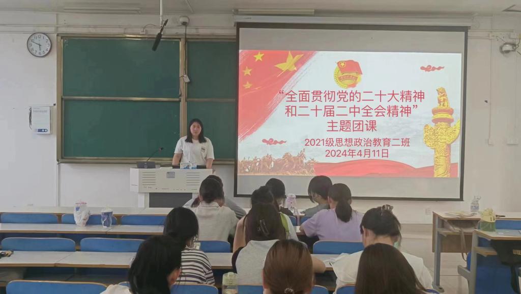 4月11日下午,sjb世俱杯网站2021级思想政治教育二班在社科楼514教室召开“全面贯彻党的二十大精神和二十届二中全会精神”主题团课。2021级思想政治教育二班全体团员参加此次团课。团课由团支书王婧欣主持。