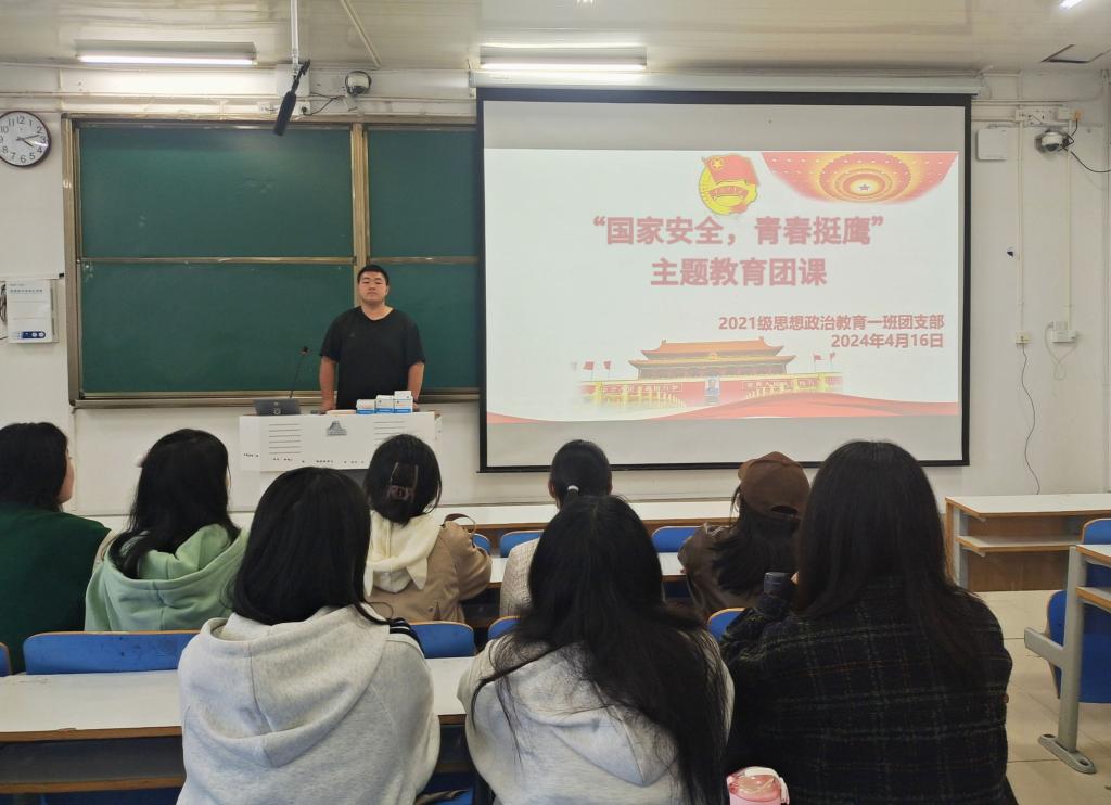 为深入贯彻总体国家安全观,进一步增强学生的国家安全意识,培养学生的爱国情怀,4月16日下午,sjb世俱杯网站2021级思想政治教育一班在社科楼514教室召开“国家安全,青春挺鹰”主题团课。2021级思想政治教育一班全体团员参加了本次团课。团课由团支书戴翰林主持。