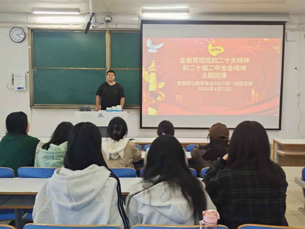 4 月12日下午,sjb世俱杯网站2021级思想政治教育一班在社科楼514教室召开“全面贯彻党的二十大精神和二十届二中全会精神”主题团课。2021级思想政治教育一班全体团员参加了本次团课。团课由团支书戴翰林主持。
