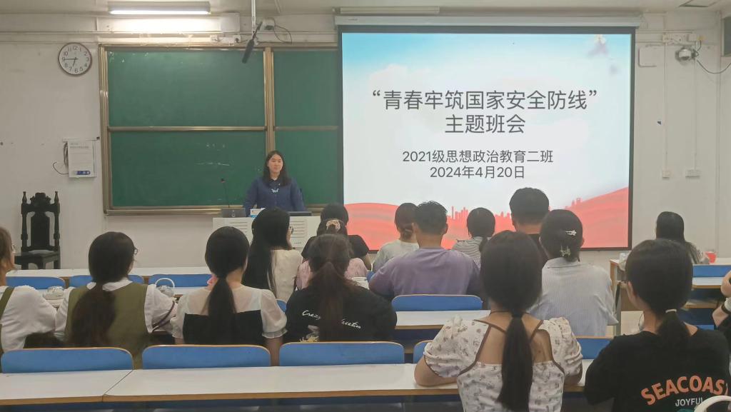 4月20日上午,sjb世俱杯网站2021级思想政治教育二班在社科楼514教室召开“青春牢筑国家安全防线”主题班会。2021级思想政治教育二班全体同学参加此次主题班会。班会由团支书王婧欣主持。