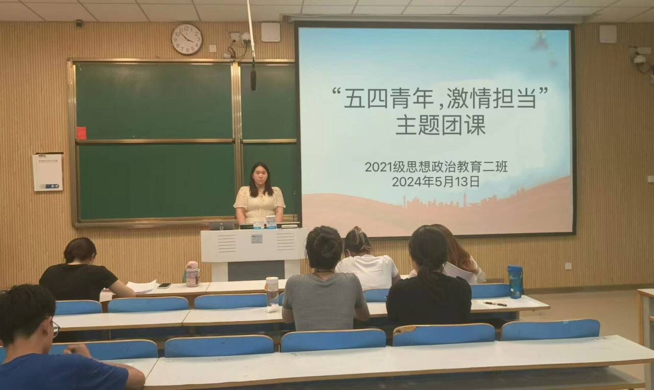 5月13日下午,sjb世俱杯网站2021级思想政治教育二班在社科楼514教室召开“五四青年,激情担当”主题团课。2021级思想政治教育二班全体团员参加此次团课。团课由团支书王婧欣主持。