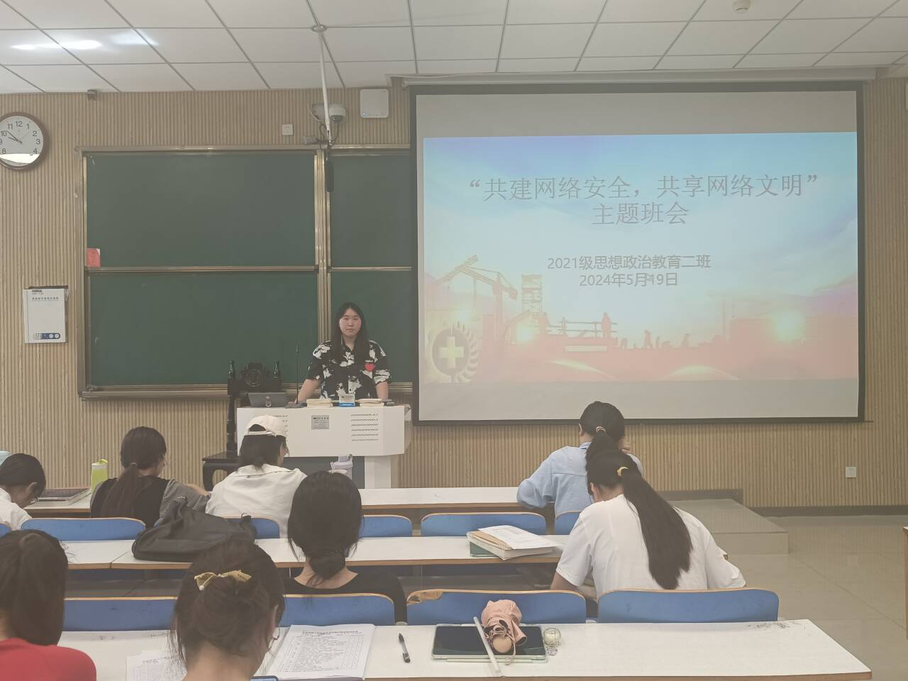 5月19日下午,sjb世俱杯网站2021级思想政治教育二班在社科楼514教室召开“共建网络安全,共享网络文明”主题班会。2021级思想政治教育二班全体同学参加此次班会。班会由团支书王婧欣主持。