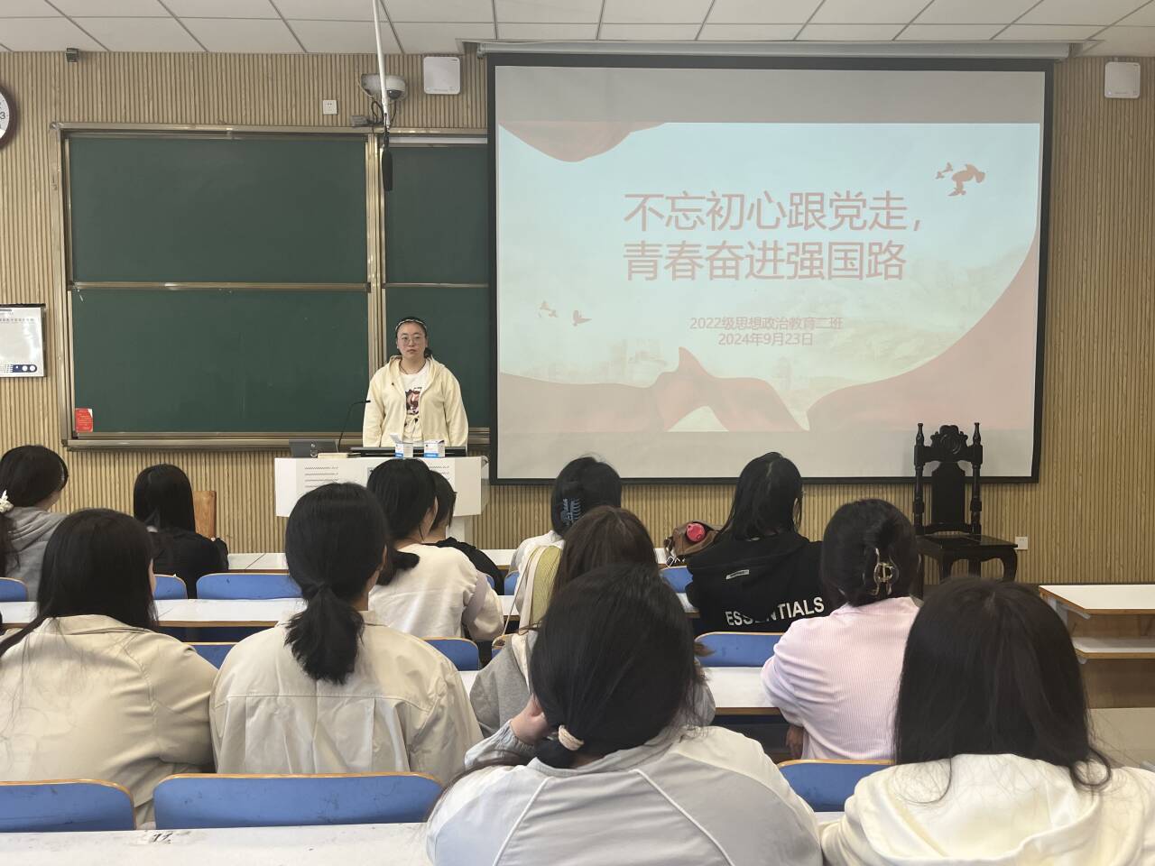9月23日上午,sjb世俱杯网站2022级思想政治教育二班在社科楼515教室开展“不忘初心跟党走,青春奋进强国路”主题团课。世俱杯官网2022级思想政治教育二班全体成员共同参与此次团课。团课由团支书李佳音主持。