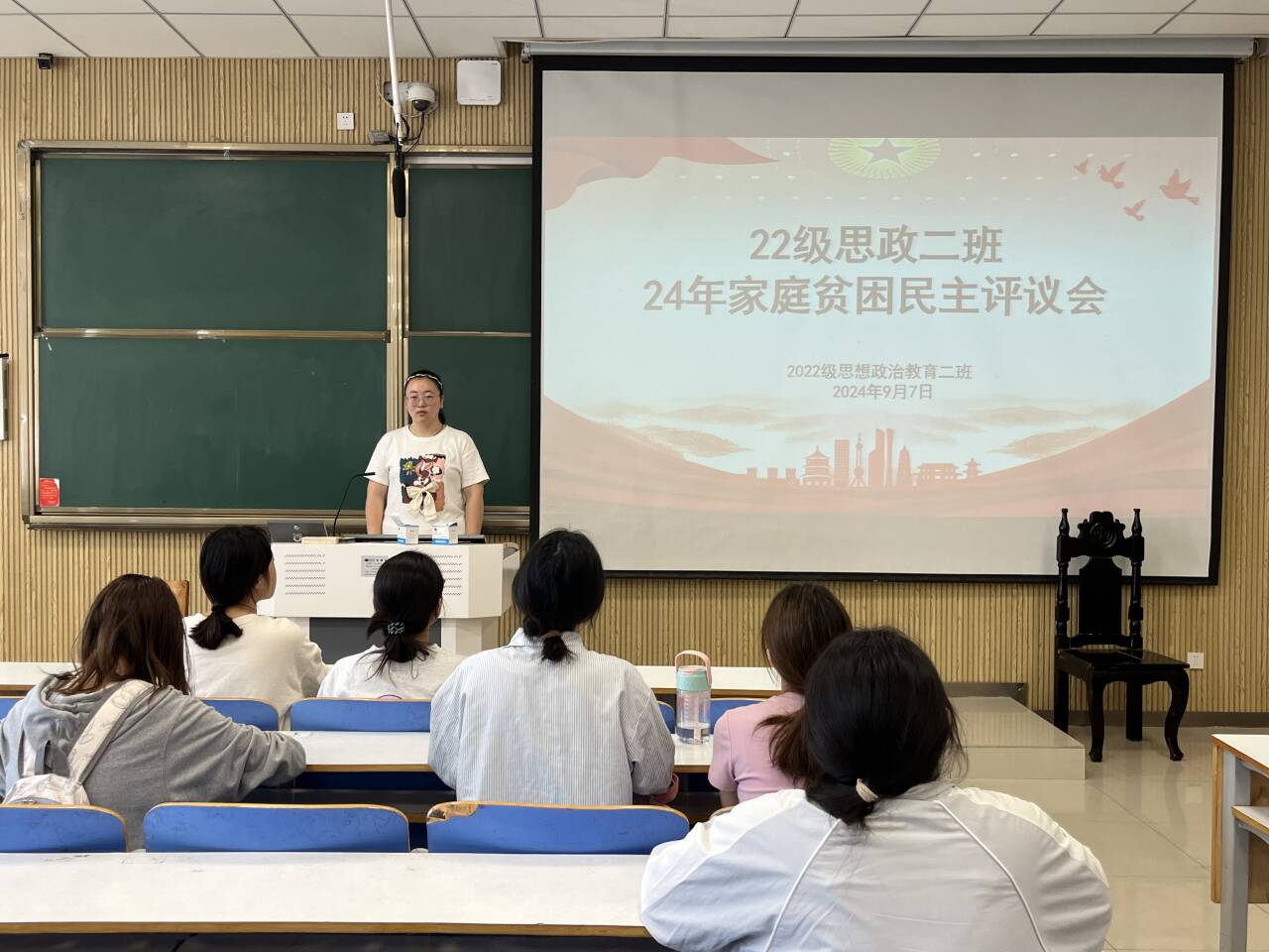 9月7日下午,sjb世俱杯网站2022级思想政治教育二班在社科楼514教室召开2024年家庭贫困民主评议会。世俱杯官网2022级思想政治教育二班民主评议小组共同参与此次评议会。会议由班长李佳音主持。