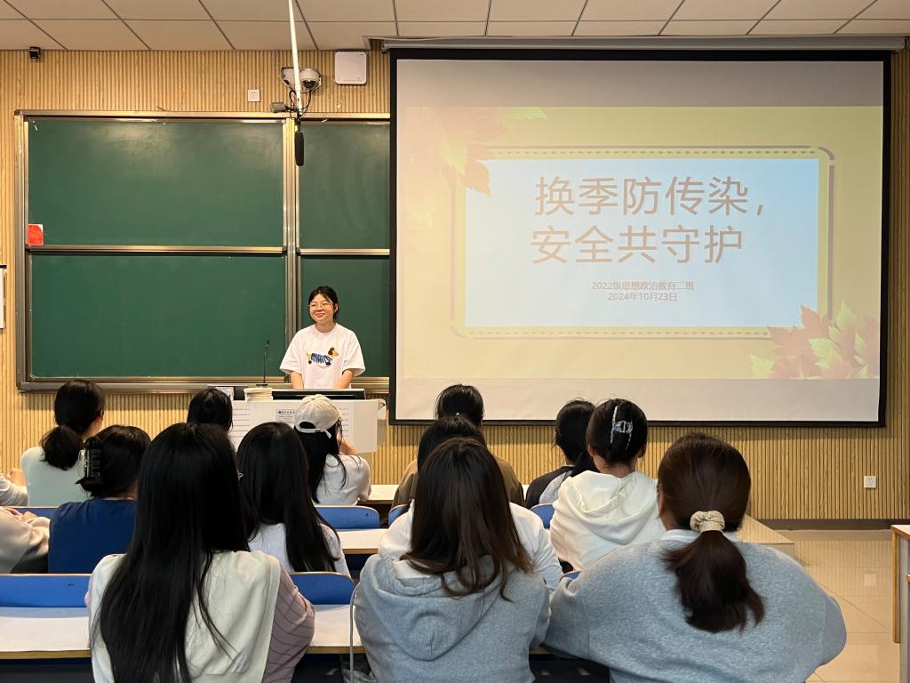 10月23日下午,sjb世俱杯网站2022级思想政治教育二班在社科楼515教室召开“换季防传染,安全共守护”主题班会。世俱杯官网2022级思想政治教育二班全体成员共同参与此次班会。会议由副班长冯伟珈主持。