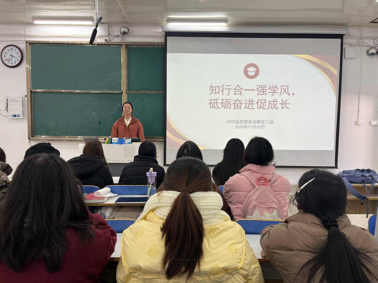 11月20日下午,sjb世俱杯网站2022级思想政治教育二班在社科楼514教室召开“知行合一强学风,砥砺奋进促成长”主题班会。世俱杯官网2022级思想政治教育二班全体成员共同参与此次班会。会议由学习委员谢佳邑主持。
