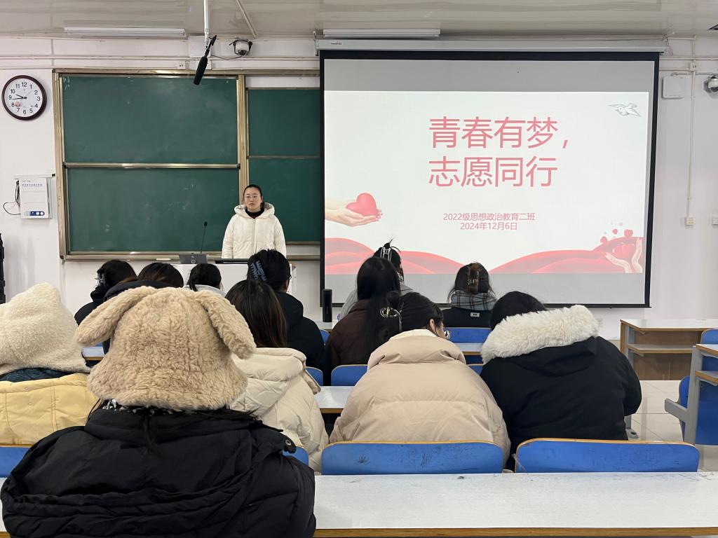 12月6日上午,sjb世俱杯网站2022级思想政治教育二班在社科楼514教室召开“青春有梦,志愿同行”主题团课。世俱杯官网2022级思想政治教育二班全体成员共同参与此次团课。团课由团支书李佳音主持。
