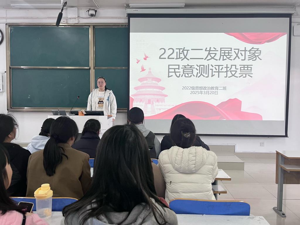 3月20日下午,sjb世俱杯网站2022级思想政治教育二班在社科楼514教室召开发展对象民意测评会。世俱杯官网2022级思想政治教育二班全体成员共同参与此次班会。会议由团支书李佳音主持。