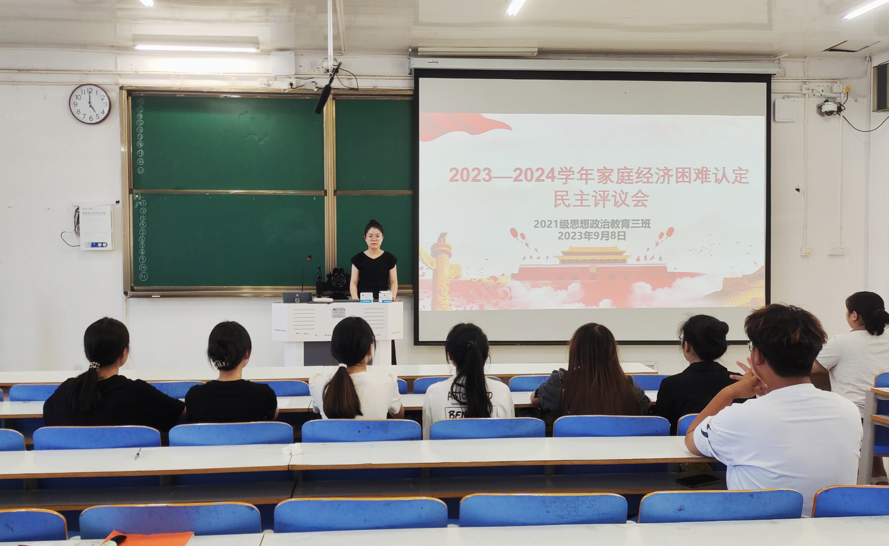 9月8日下午,sjb世俱杯网站2021级思想政治教育三班在社科楼514教室召开2023—2024学年家庭经济困难认定民主评议会。高小佳老师、2021级思想政治教育三班贫困认定委员团全体成员以及权益保障部靳澍畅、宣传委员陈笑宇、组织委员秦梦莹参与此次会议。会议由辅导员高小佳主持。