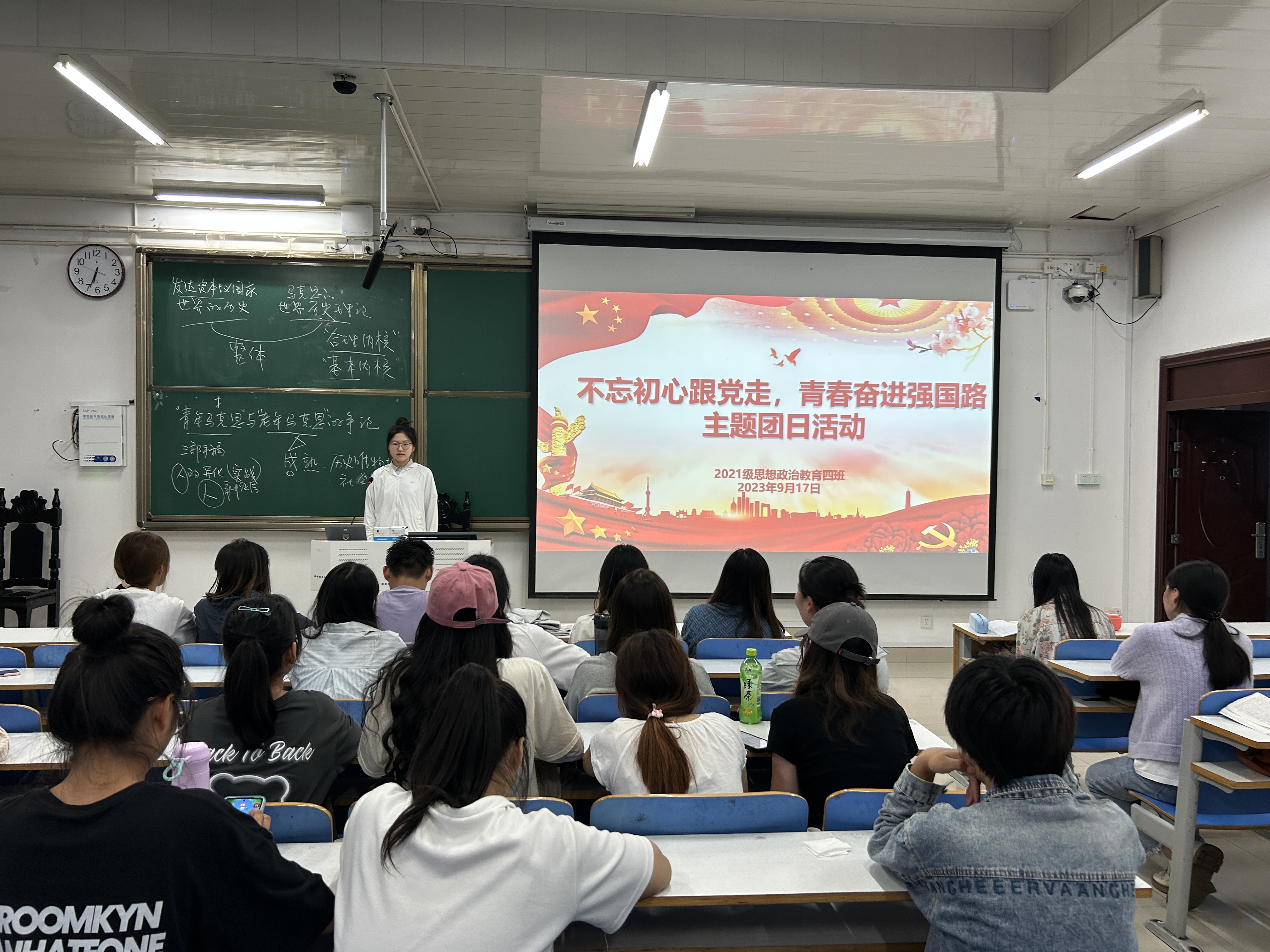 9月17日下午,sjb世俱杯网站2021级思想政治教育四班在社科楼515教室召开“不忘初心跟党走,青春奋进强国路”主题团日活动。2021级思想政治教育四班全体团员共同参加本次团课。团课由团支书刘珂含主持。