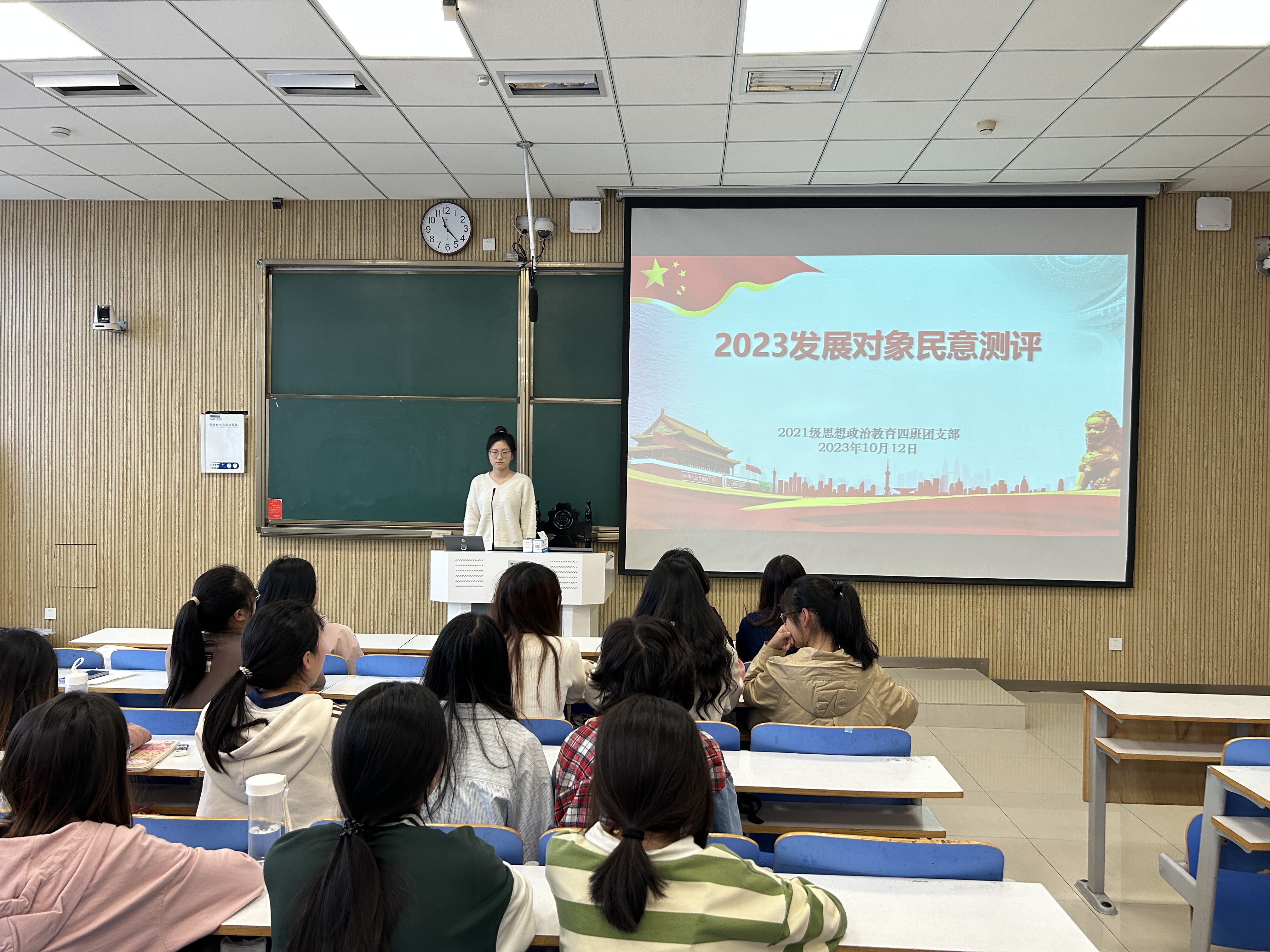 10月12日下午,sjb世俱杯网站2021级思想政治教育四班在社科楼514教室召开2023年发展对象民意测评会。2021级思想政治教育四班全体团员共同参会。会议由团支书刘珂含主持。