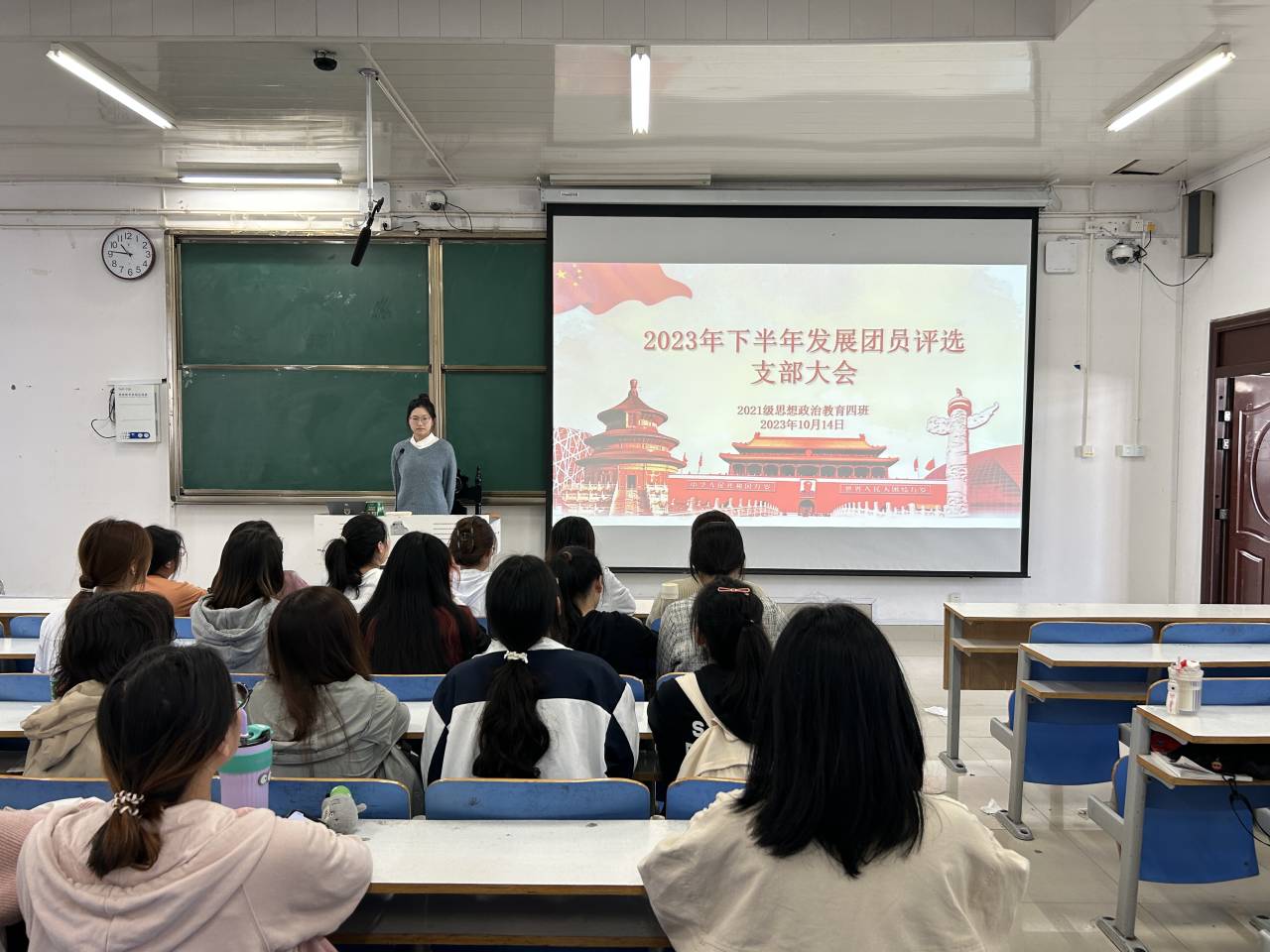 10月14日下午,sjb世俱杯网站2021级思想政治教育四班召开2023下半年发展团员评选支部大会。2021级思想政治教育四班全体团员共同参会。会议由团支书刘珂含主持。