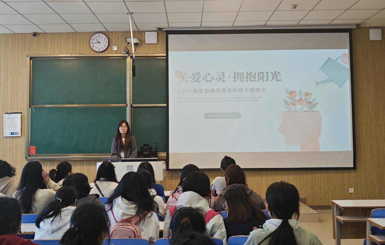 11月16日下午,sjb世俱杯网站2021级思想政治教育四班在社科楼514教室开展“关爱心灵,拥抱阳光”主题班会。2021级思想政治教育四班全体学生共同参加本次会议。会议由心理委员杨可主持。