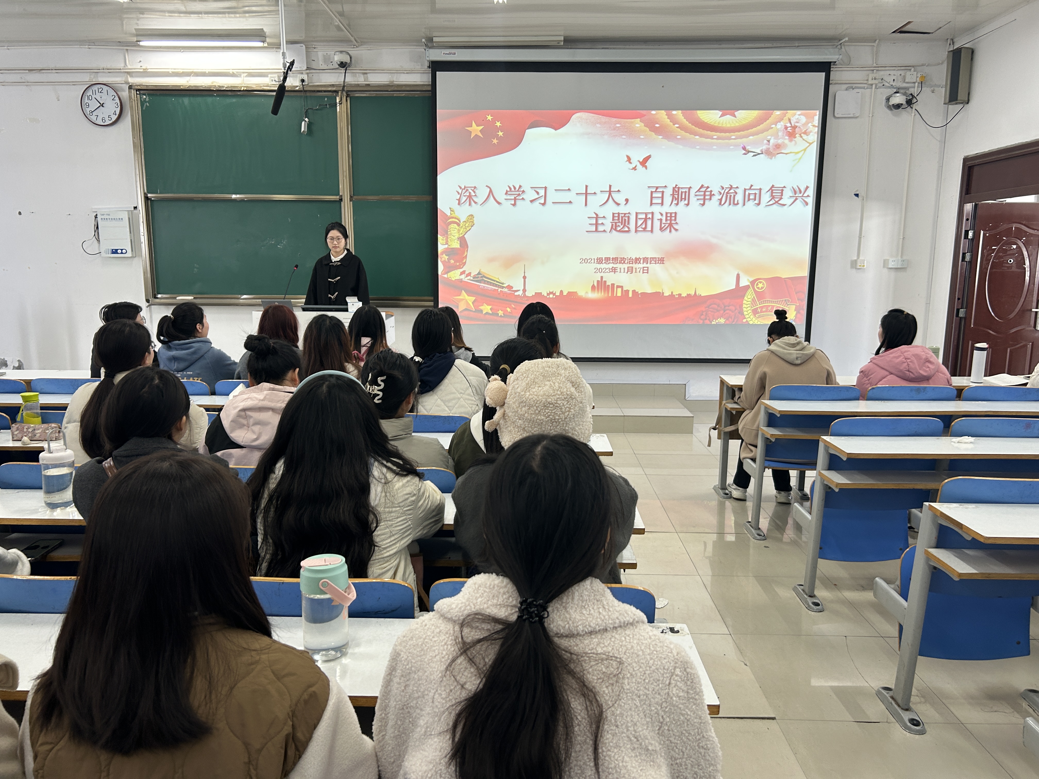 11月17日上午,sjb世俱杯网站2021级思想政治教育四班在社科楼515教室开展“深入学习二十大,百舸争流向复兴”主题团课。2021级思想政治教育四班全体学生共同参加本次团课。团课由团支书刘珂含主持。