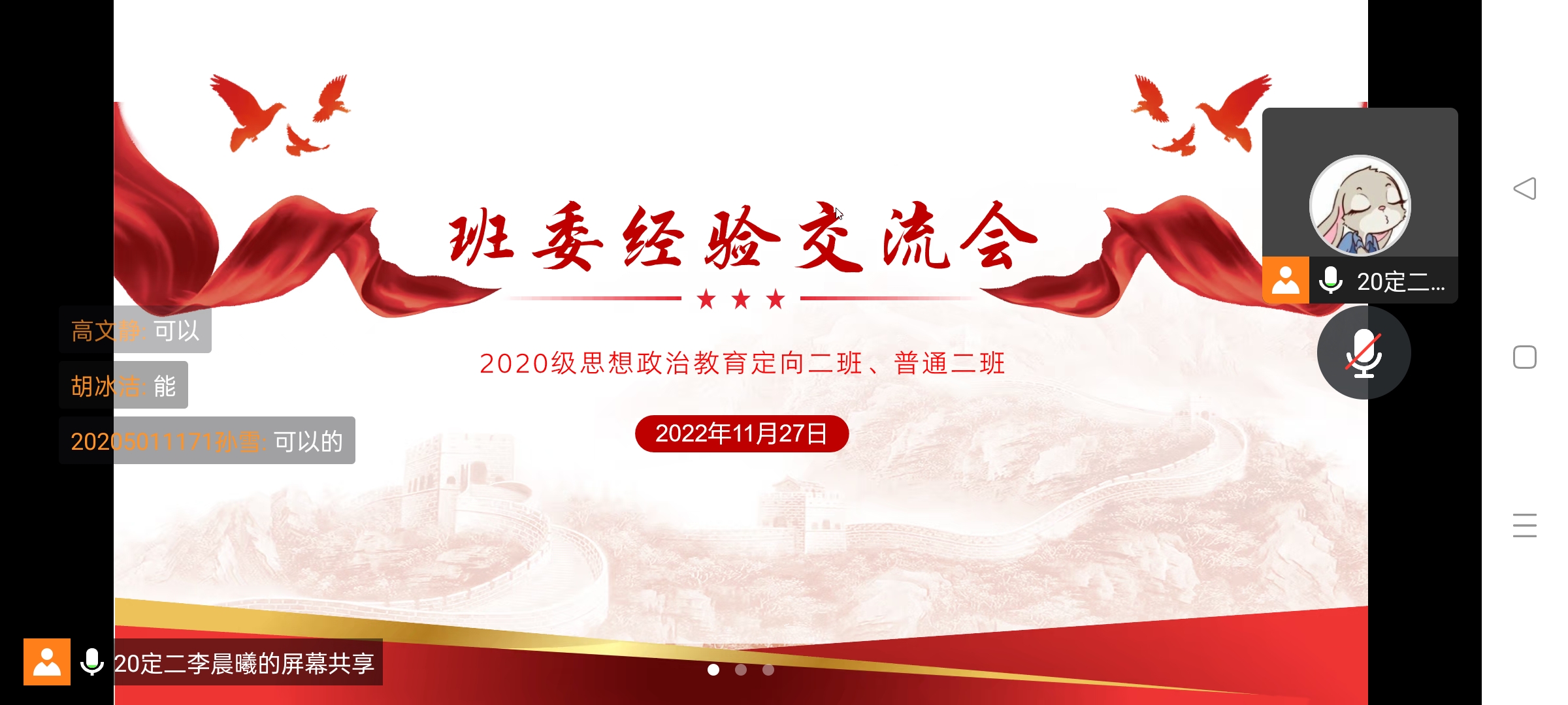11月27日晚上,sjb世俱杯网站2020级思想政治教育二班、定向二班通过腾讯会议召开线上班委经验交流会。二班、定向二班全体班委参加本次会议。会议由团支书李晨曦主持。