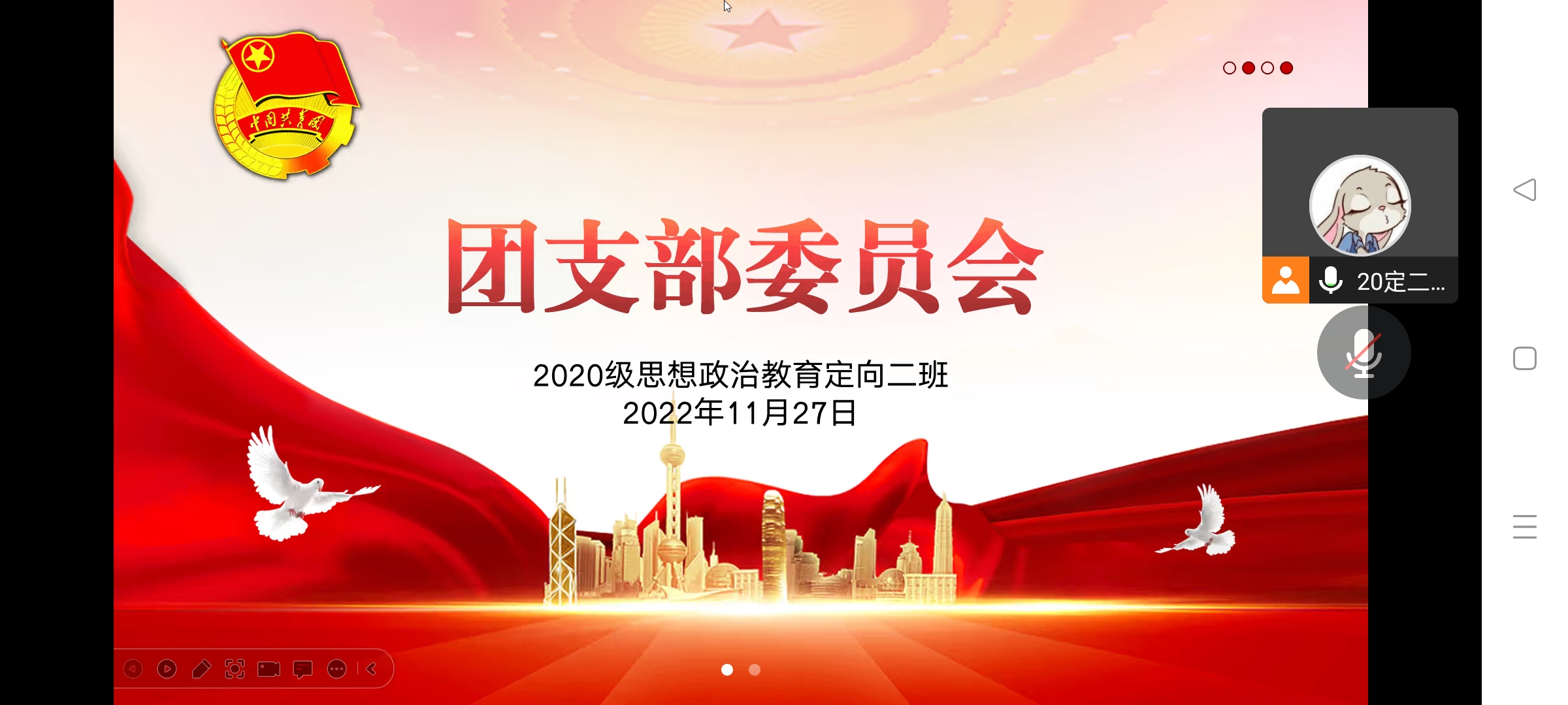 11月27日晚上,sjb世俱杯网站2020级思想政治教育定向二班通过腾讯会议召开班委工作线上述职会。定向二班全体班委准时参会。会议由团支书李晨曦主持。
