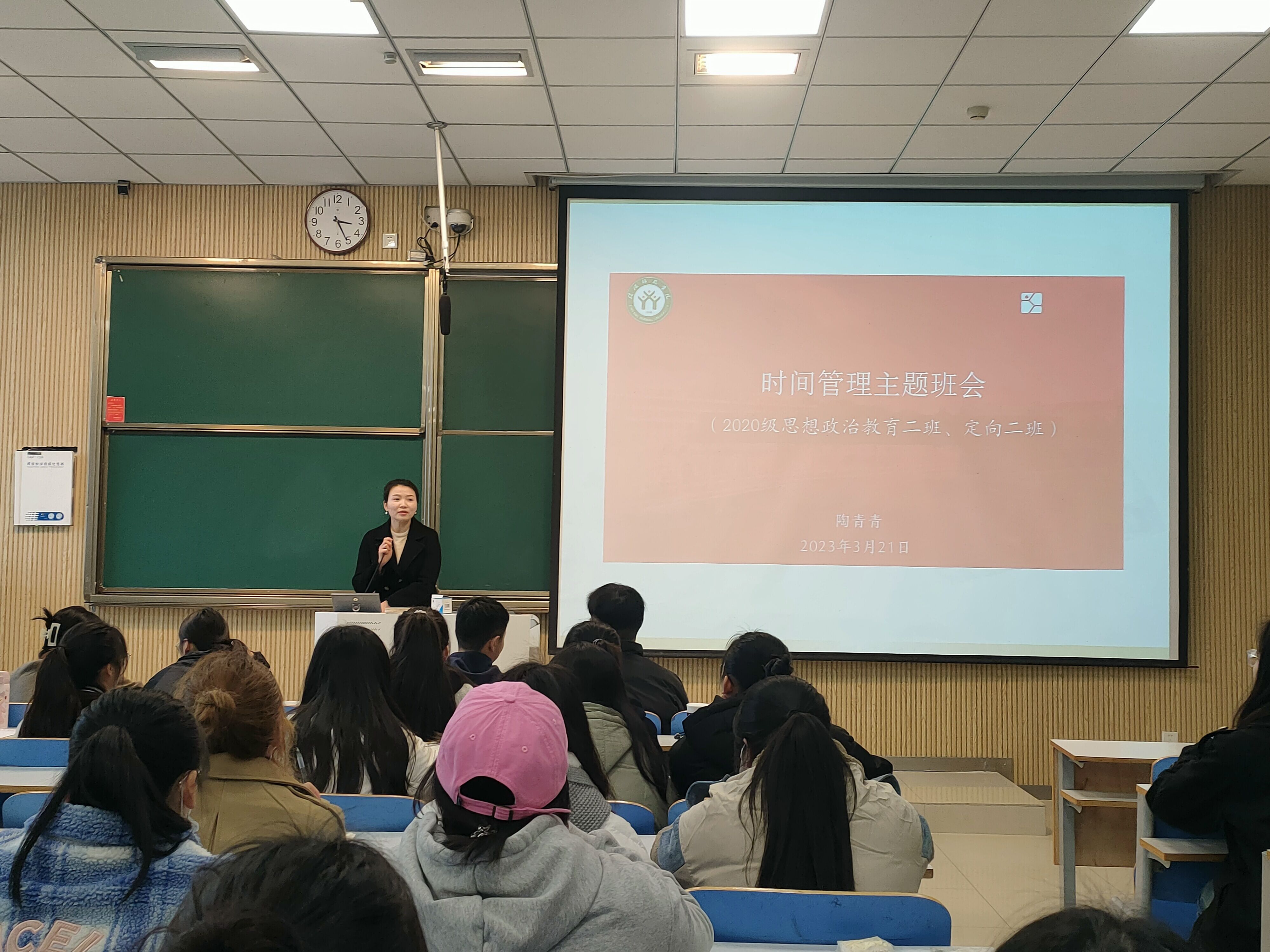3月21日下午,sjb世俱杯网站2020级思想政治教育二班、定向二班在社科楼515教室召开时间管理主题班会。辅导员陶青青、二班、定向二班全体同学共同参会。班会由陶青青主持。