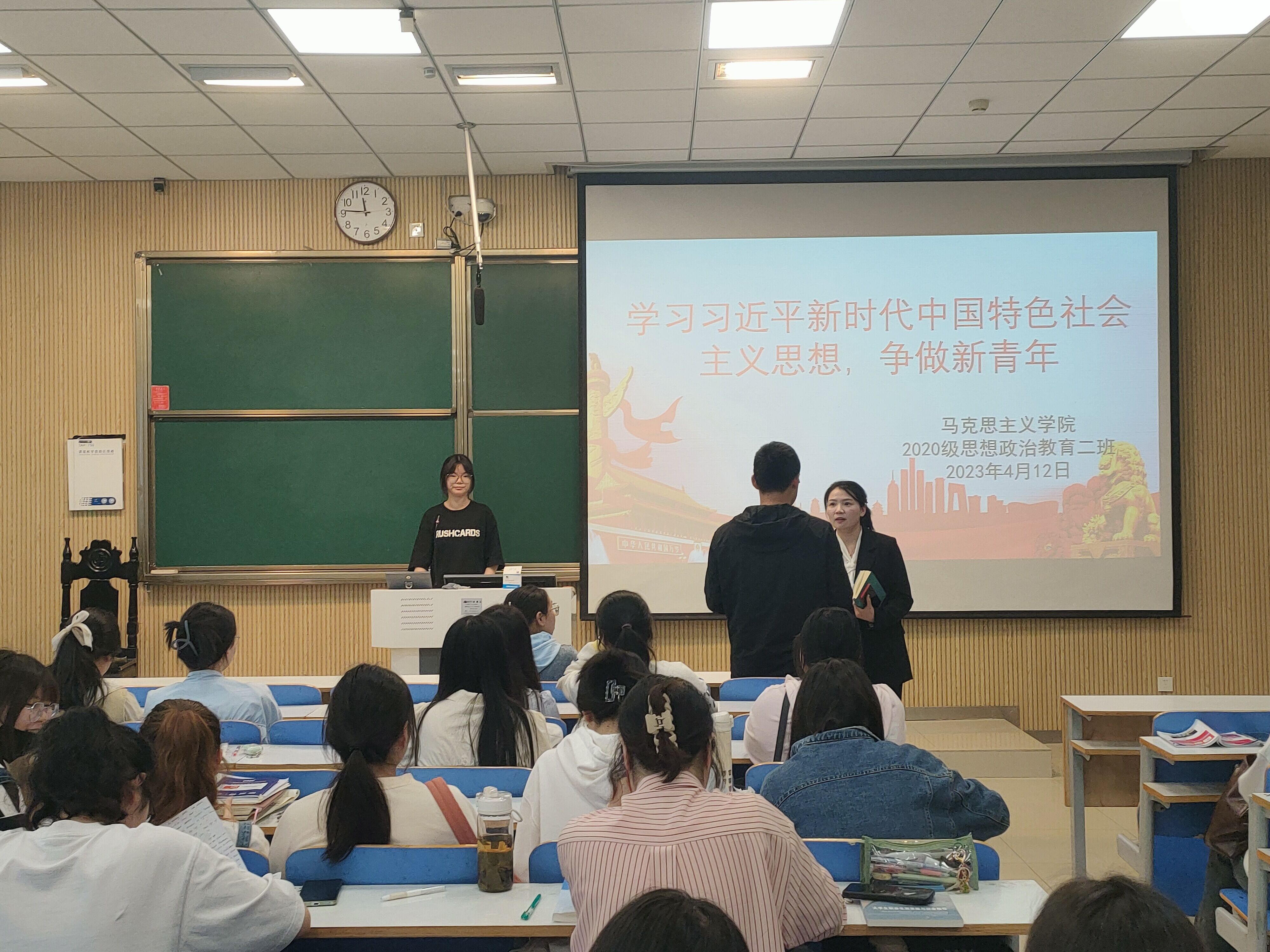 感悟思想伟力,凝聚奋进力量。为积极响应我校关于开展学习宣传贯彻习近平新时代中国特色社会主义思想主题教育的通知要求,推动我班理论学习进一步走深走实,4月12日上午,sjb世俱杯网站2020级思想政治教育二班、定向二班团支部在社科楼515教室开展“学习习近平新时代中国特色社会主义思想,争做新时代青年”主题团课。二班、定向二班全体团员共同参与此次团课。团课由团支书李晨曦讲授。
