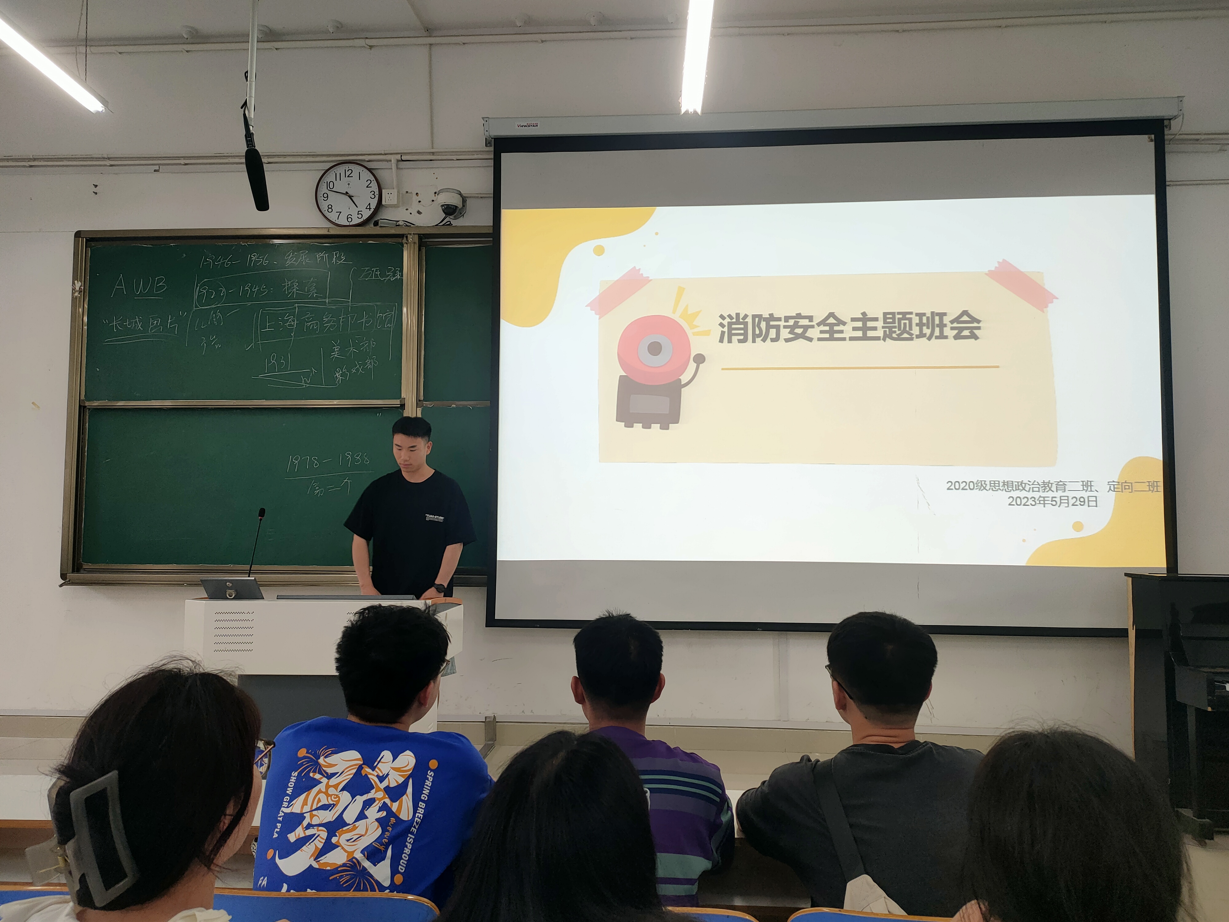 为加强学生安全教育,提高同学们的消防安全意识,5月29日下午,sjb世俱杯网站2020级思想政治教育二班、定向二班在社科楼327教室召开消防安全教育主题班会。2020级思想政治教育二班、定向二班全体学生共同参与本次班会。班会由班长高红凯主持。