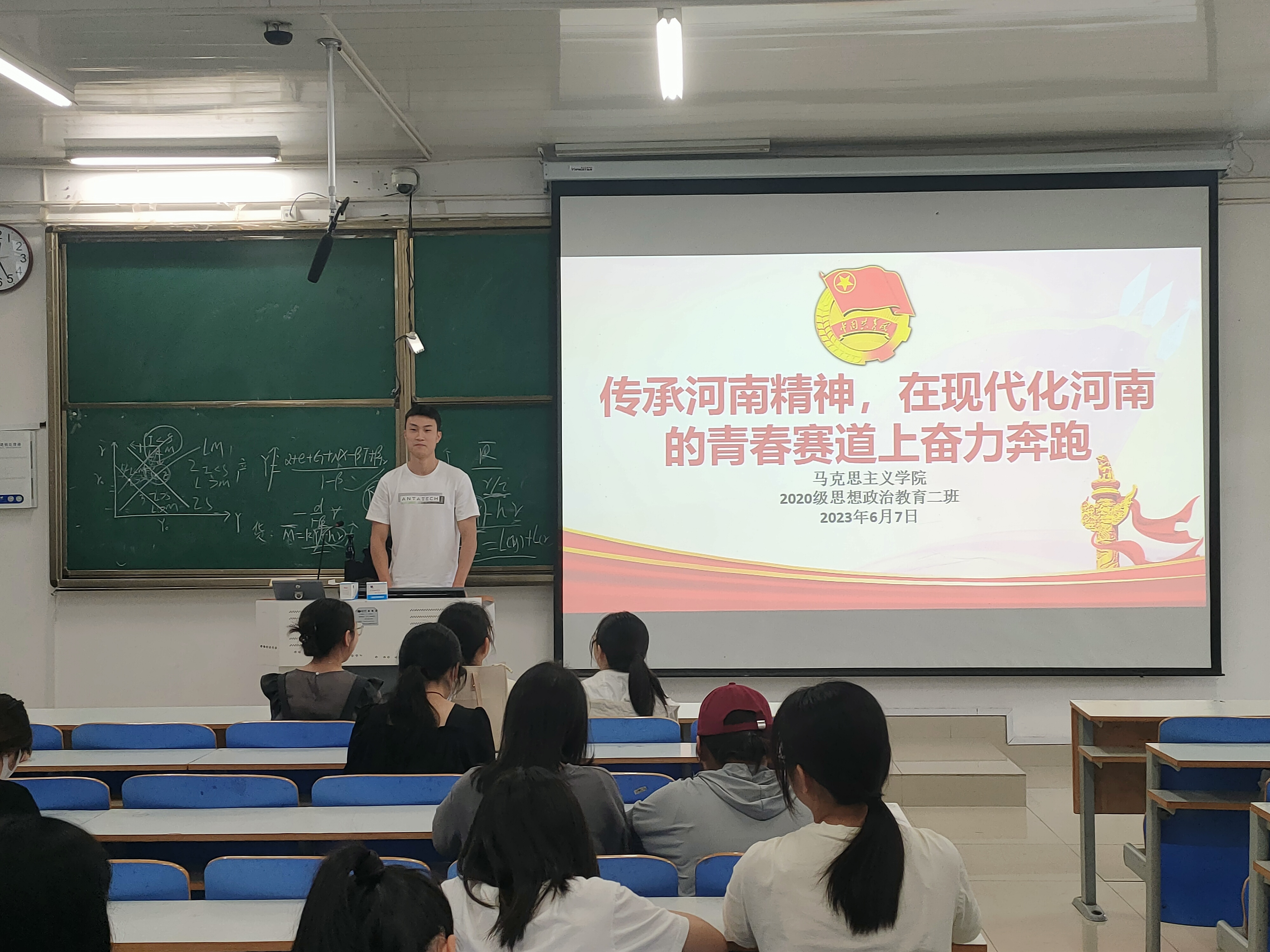为重温河南省第十一次党代会精神,激发青年学生拼搏奋进内生动力,6月7日上午,sjb世俱杯网站2020级思想政治教育二班、定向二班在社科楼514教室开展“重温河南省第十一次党代会精神,凝聚现代化河南建设伟力”主题团课。二班、定向二班全体团员共同参与本次团课。团课由团支书陈宇航主持。