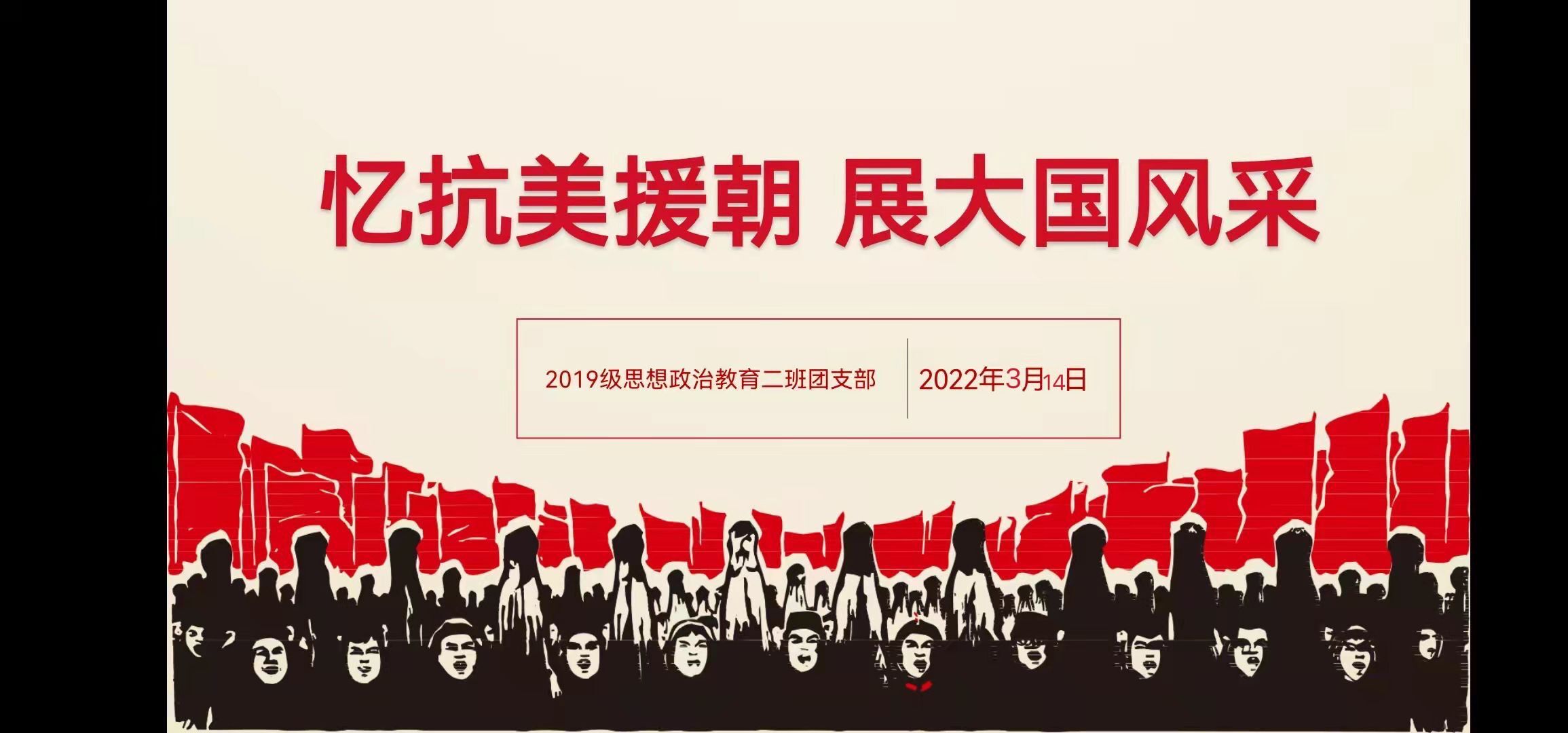 为缅怀革命先烈,弘扬民族精神,加强团员青年爱国主义教育,厚植爱国主义情怀,3月14日上午,世俱杯官网2019级思想政治教育二班在腾讯会议召开“忆抗美援朝,展大国风采”网上主题团课。2019级思想政治教育二班全体成员共同参会。会议由团支书孙雅娴主持。