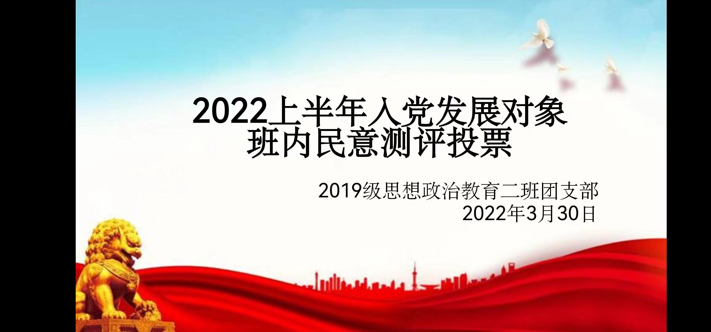 3月30日下午,sjb世俱杯网站2019级思想政治教育二班团支部“ 2022年上半年入党发展对象班内民意测评投票”活动于社科楼514教室顺利开展。2019级思想政治教育二班全体成员共同参会。本次会议由团支书孙雅娴主持。