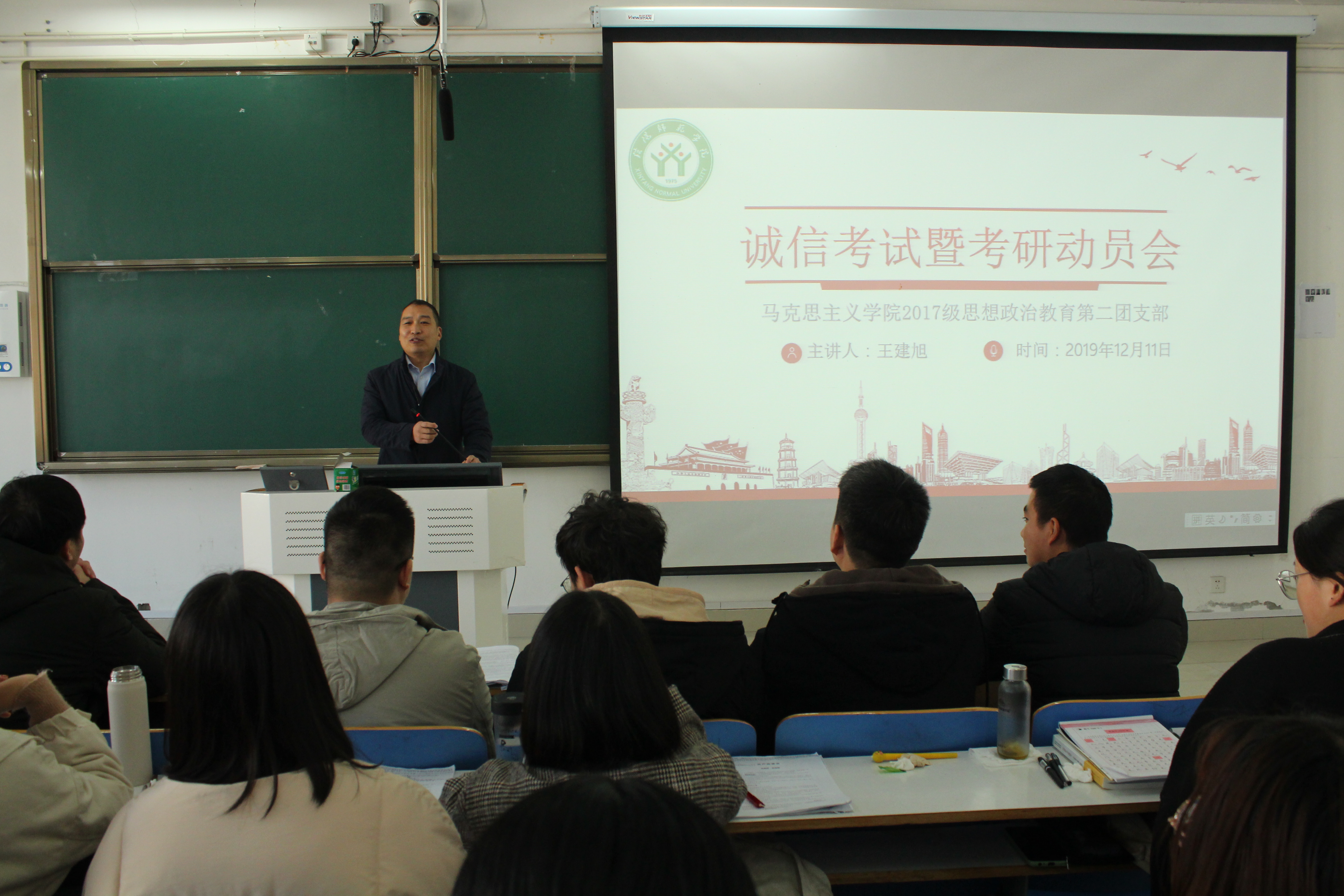 为强化纪律意识,充分调动学生的学习积极性,进一步坚定考研信心、明确目标方向。12月11日上午,sjb世俱杯网站2017级思想政治教育第二团支部在社科楼516教室顺利开展了诚信考试暨考研动员会。团支部第一支部书记王建旭,班级辅导员孙绪曙及2017级第二团支部全体成员共同参加。会议由孙绪曙主持。