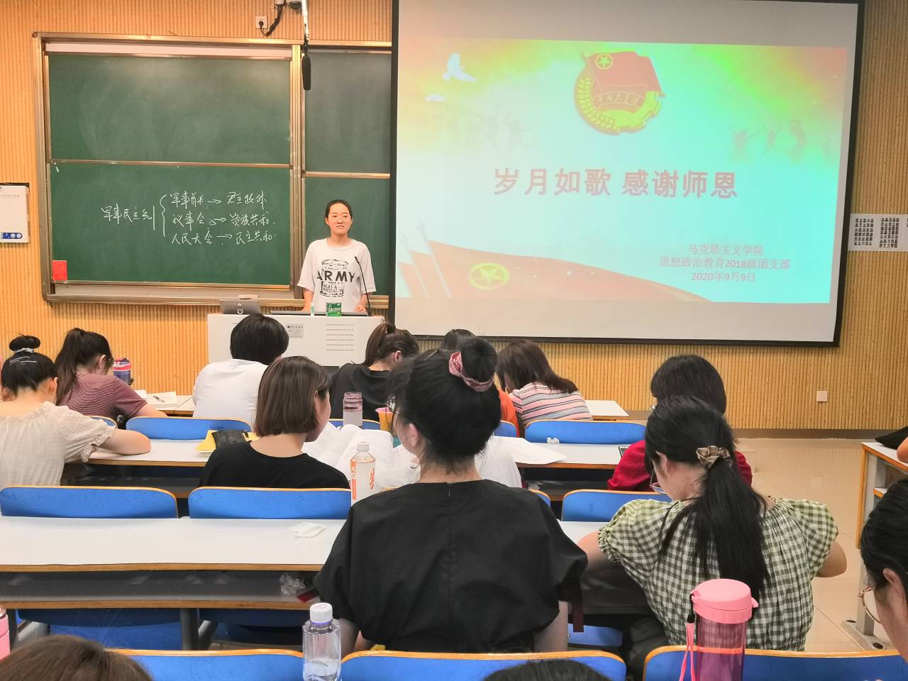 9月8日上午,sjb世俱杯网站2018级思想政治教育团支部在社科楼515教室顺利开展“岁月如歌,感谢师恩”主题团会。2018级全体学生共同参加此次会议。会议由第二团支部书记黄子晋主持。