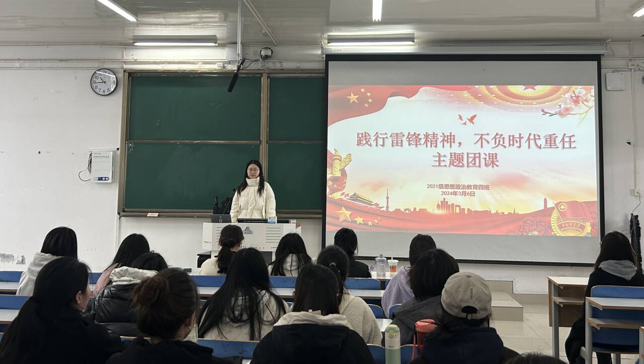 为大力弘扬雷锋精神,传承雷锋艰苦朴素的优良作风,3月6日上午,sjb世俱杯网站2021级思想政治教育四班在社科楼514教室开展“践行雷锋精神,不负时代重任”主题团课。2021级思想政治教育四班全体成员共同参加本次团课,团课由团支书刘珂含主持。