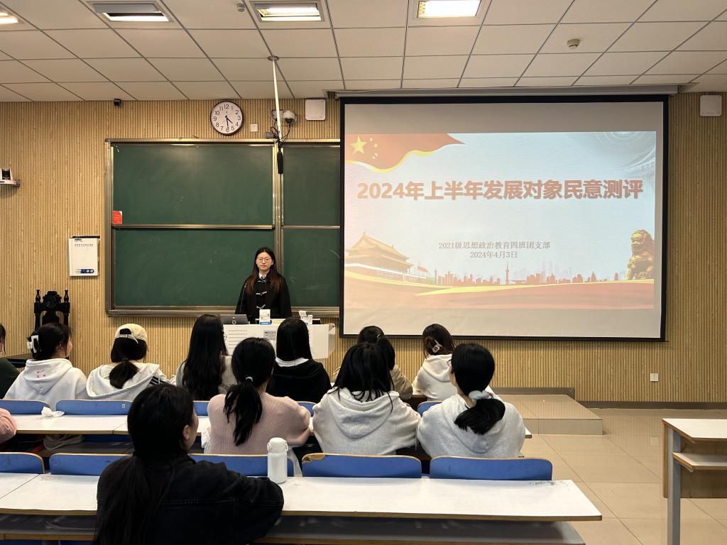 4月3日下午,sjb世俱杯网站2021级思想政治教育四班在社科楼514教室召开2024年发展对象民意测评。2021级思想政治教育四班全体团员共同参会。会议由团支书刘珂含主持。